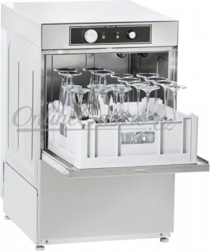 Mycí teplota 60°C / oplachová teplota 85°C, minimalizace ztrát tlaku vody díky výkonnému mycímu čerpadlu (300W). Dvouplášťová dvířka komory s mikrospínačem, vybavena dávkovačem oplachového a mycího prostředku (DD) a také odpadovým čerpadlem (B).
