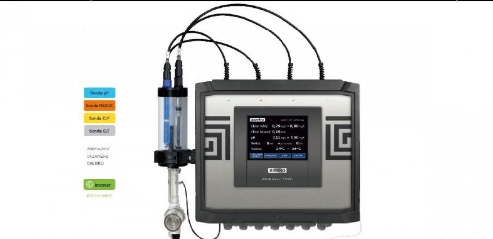 ASIN Aqua PROFI je řídící automat určený pro veřejný sektor s nejvyššími požadavky na přesnost řízení a splnění veškerých hygienických norem. Automat je vybavený sondou CLF pro měření volného chloru, sondou Redox, sondou pH a volitelně sondou CLT pro měření celkového chloru. Vhodný pro použití s externími dávkovacími čerpadly.