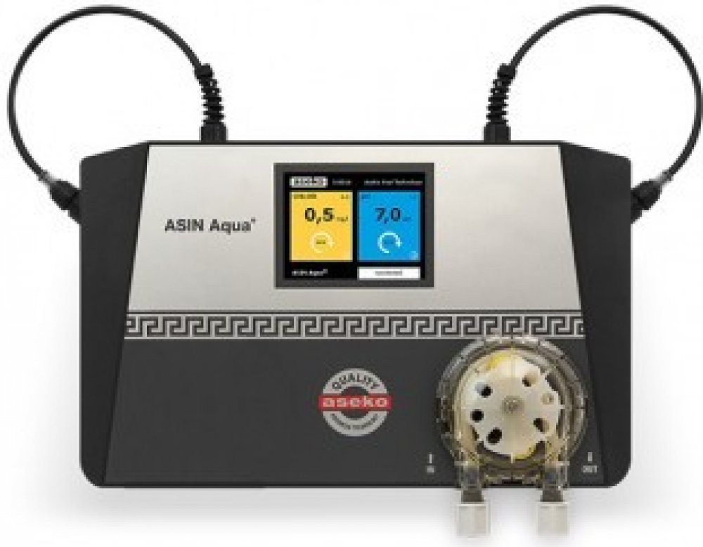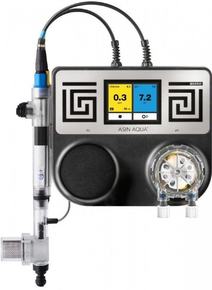 ASIN Aqua S CLF je dávkovací automat vybavený sondou CLF pro měření volného chloru a sondou pH. Vhodný pro použití ve spojení s ASIN Salt (elektrolyzérem slané vody).