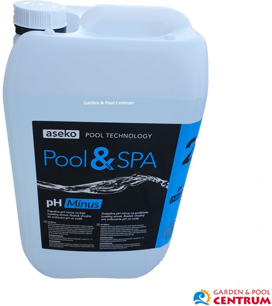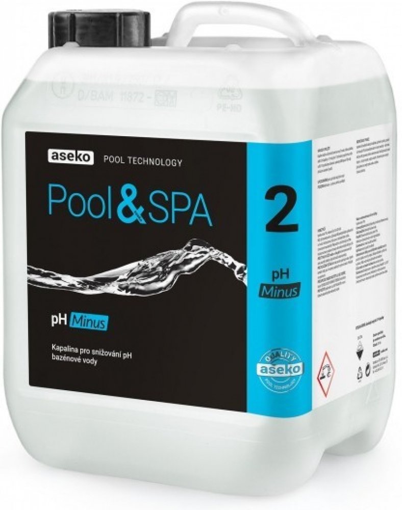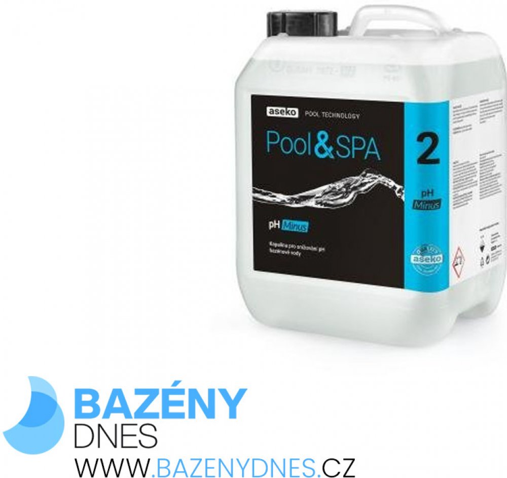 pH minus je kapalina pro snižování pH bazénové vody. Pro vodu s bežnou alkalitou sníží 30 ml kapaliny v 1 m3 vody pH o 1. Tato hodnota je průměrná a může se lišit. Při používání pro dávkování s automaty ASIN Aqua se řiďte vždy příslušným návodem.