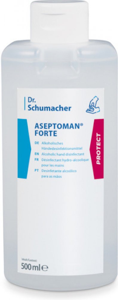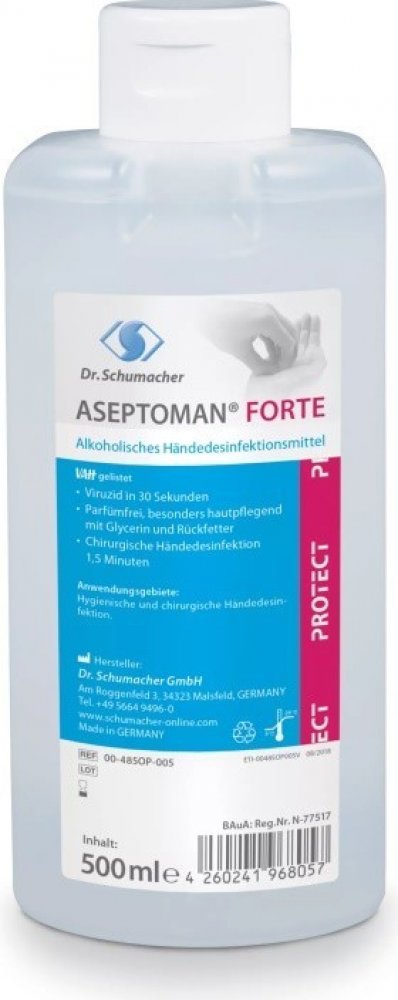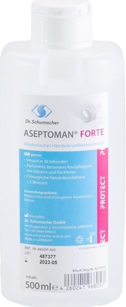 Složení (obsahující vysoce koncentrovaný ethanol, změkčovadla a lipidové složky bez vůní a barviv) zajišťuje omezenou virucidní aktivitu (v souladu s EN 14476) do 30 sekund od aplikace pro hygienickou dezinfekci rukou. Jako chirurgická dezinfekce rukou Aseptoman FORTE začne působit po 1,5 minutě od aplikace. Splňuje také nejnovější požadavky na dezinfekční prostředky pro ruce jako biocid. Aseptoman FORTE je k dostání v balení o objemu 100 ml nebo 500 ml.