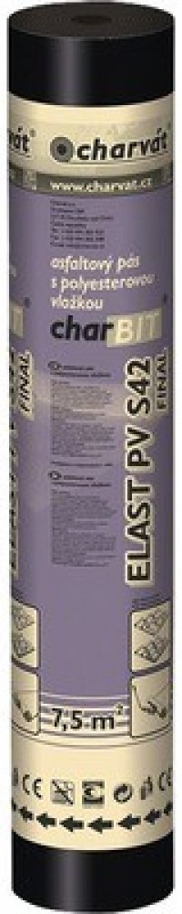 Lepenka na střechu asfaltová charBIT ELAST PV S42 FINAL role 7,5 m² natur šedá. CharBIT ELAST PV S42 FINAL je natavitelný asfaltový pás z modifikovaného asfaltu SBS s nenasákavou impregnovanou nosnou vložkou z polyesterového rouna. Pás je opatřený oboustrannou krycí vrstvou z modifkovaného asfaltu a separační vrstvou, kterou tvoří lehce tavitelná PE fólie na straně spodní a hrubozrnný barvený posyp na straně horní. Používá se jako vrchní pás střešního souvrství pro všechny druhy staveb. Jedná se o pevný pás s výbornými dilatačními schopnostmi pro nejnáročnější aplikace.