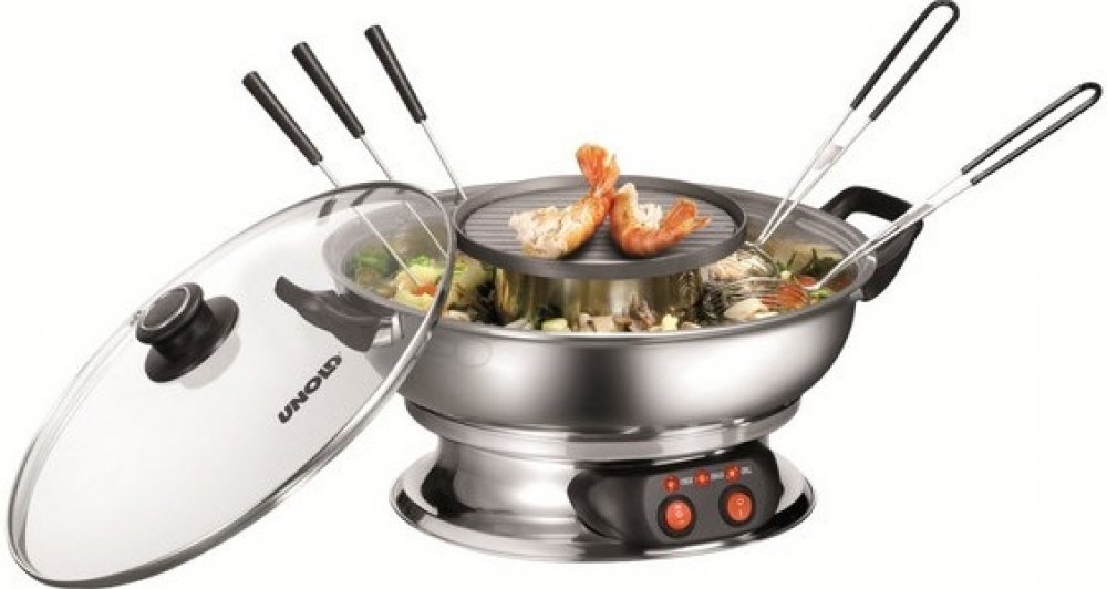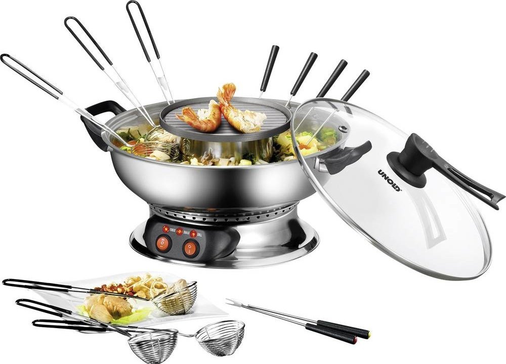Asia fondue set s funkcí grilu pro přípravu masových, zeleninových, rybích fondue se ovládá pomocí samostaných vypínačů pro gril a fondue. Teplotu lze nastavit na 2 stupně. Grilovací plát je vyjímatelný.