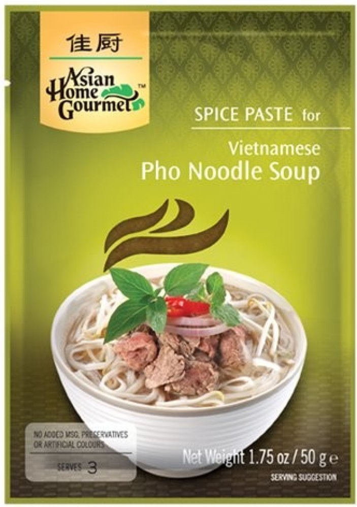 Recept: 1 balení koření na vietnamskou Pho polévku, 750 ml vody nebo hovězího nebo kuřecího vývaru, 1 hrubě nasekaná cibule, 250 g hovězího masa na tenké plátky, 150 g sušených rýžových nudlí.50 g fazolových výhonků, čerstvé listy bazalky, limetku, listy koriandru a nakrájené chilli papričky na oblohu. Přiveďte vodu nebo vývar s kořením a cibuli v hrnci do varu. Snižte teplotu a nechte 5 minut vařit. Přidejte nakrájené hovězí maso a vařte. Uvařené maso vyndejte a odložte. Naložte hovězí maso na nudle a zalíjte polévkou. Ozdobte fazolovými klíčky, bazalkovými listy, limetkou a chilli. Podávejte horké.