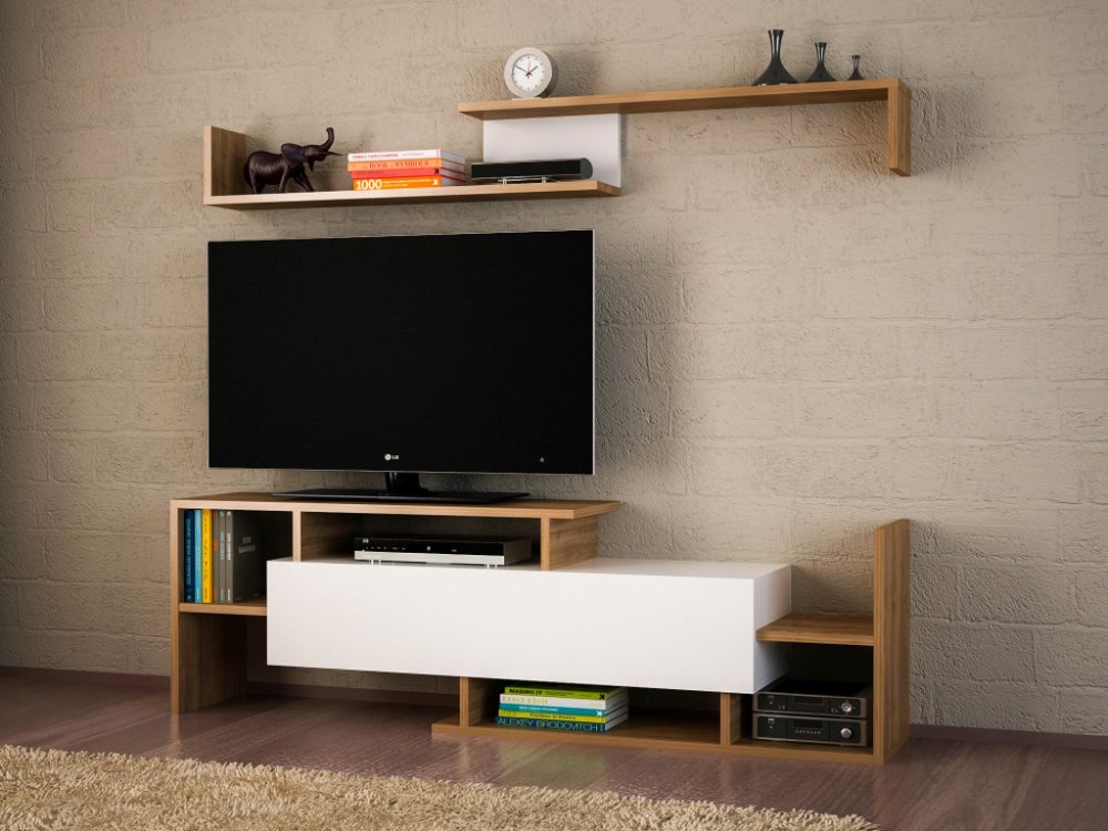 Televizní stěna s neobvyklým vzhledem, množstvím polic a uzavřeným prostorem pro drobnosti