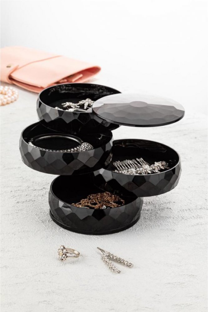 Černá plastová krabička na šperky ELMSS má čtyři otočné přihrádky, do kterých můžete ukrýt své malé poklady.