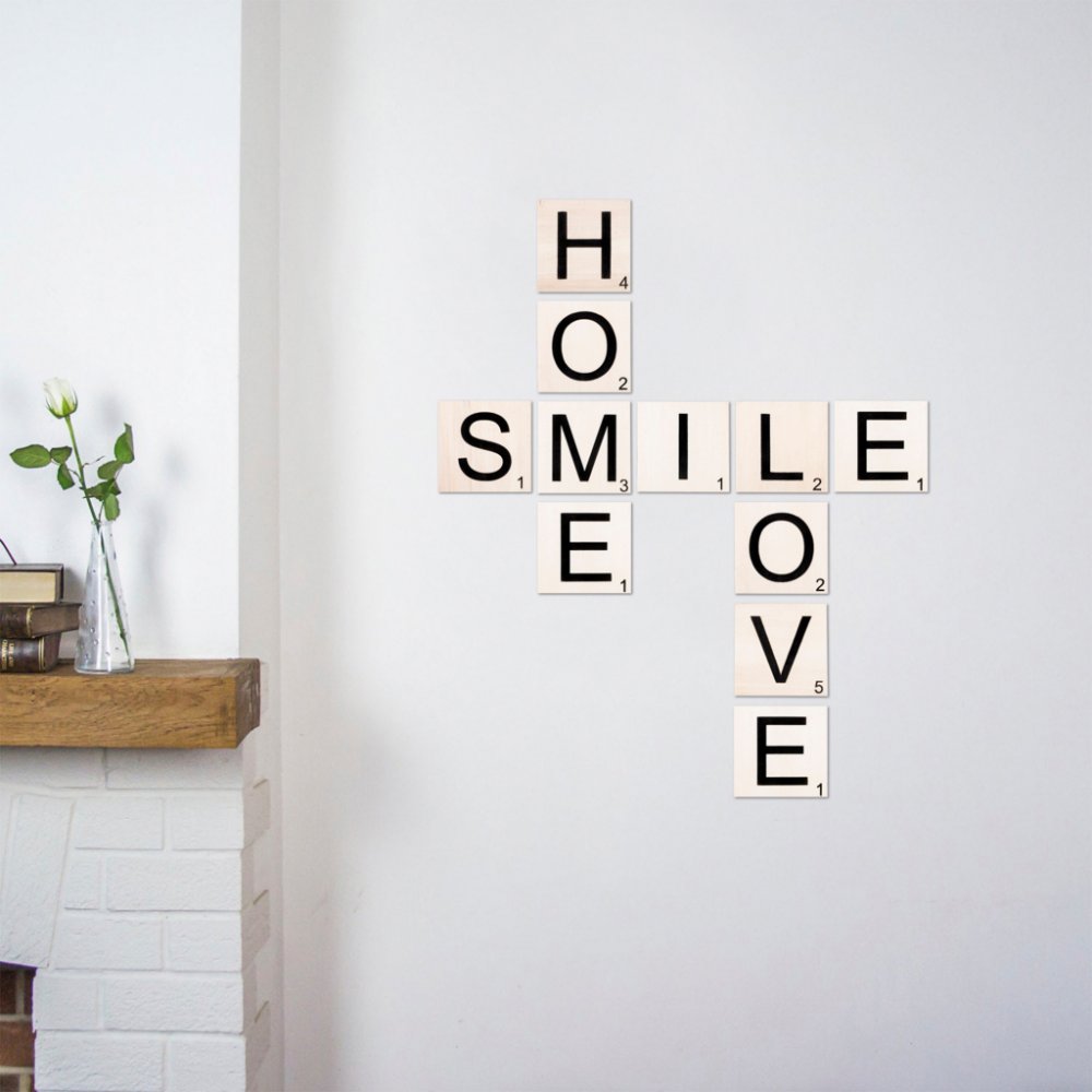 Ve známé a populární hře Scrabble se skládají písmenka do slov a tento nápad je přenesen do této nástěnné dřevěné dekorace.