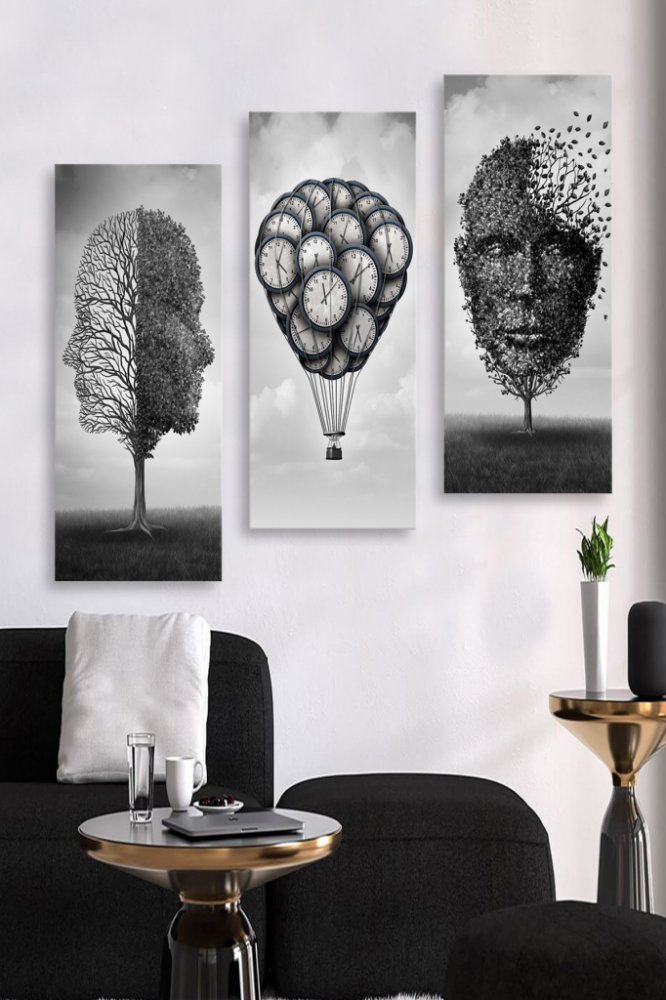 Vstupte do světa uměleckého vyjádření s naší podmanivou sadou tří obrazů. Každý panel o rozměrech 20 x 50 cm, vyrobený na vysoce kvalitní MDF desce, je pečlivě navržen tak, aby zobrazoval motiv času, začátku a konce a vystihoval hluboké pojmy života a smrti.