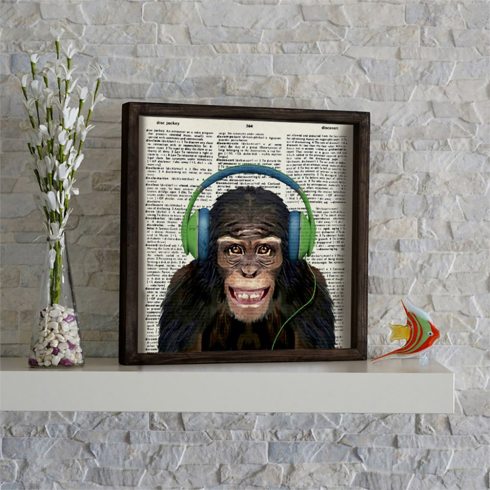 ASIR Obraz na MDF s rámem ŠIMPANZ SE SLUCHÁTKY 34 x 34 cm