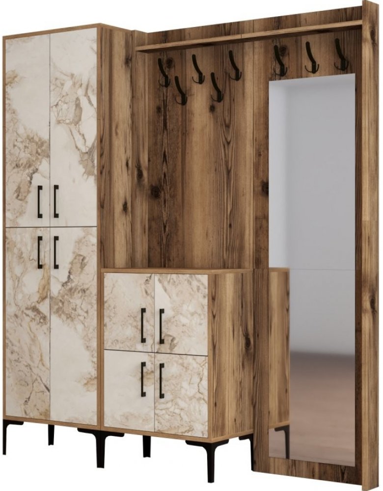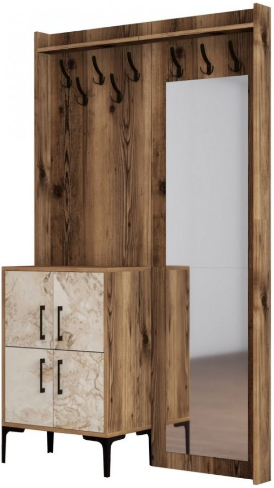 Doménou v dekoru ořech vyrobené předsíňové stěny BERLIN je velké zrcadlo usazené na desce s háčky doplněno o druhou kratší desku s botníkem uzavíratelným dvířky v dekoru mramor.