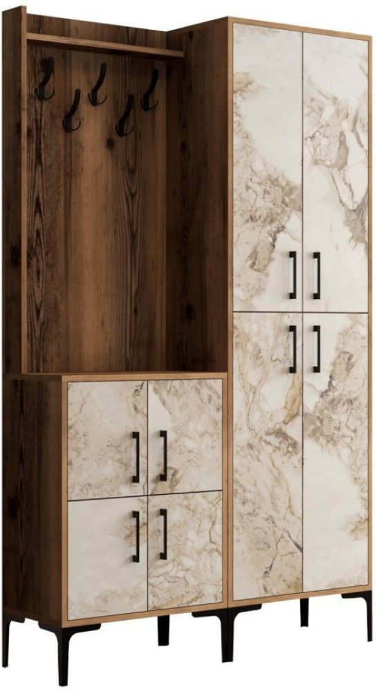 BERLIN je dvoumetrová na černých kovových nohách stojící a dostatečné množství úložného prostoru nabízející předsíňová stěna se zrcadlem, jenž je vyrobená v dekorech ořech a mramor s nápadným černým kováním a háčky.