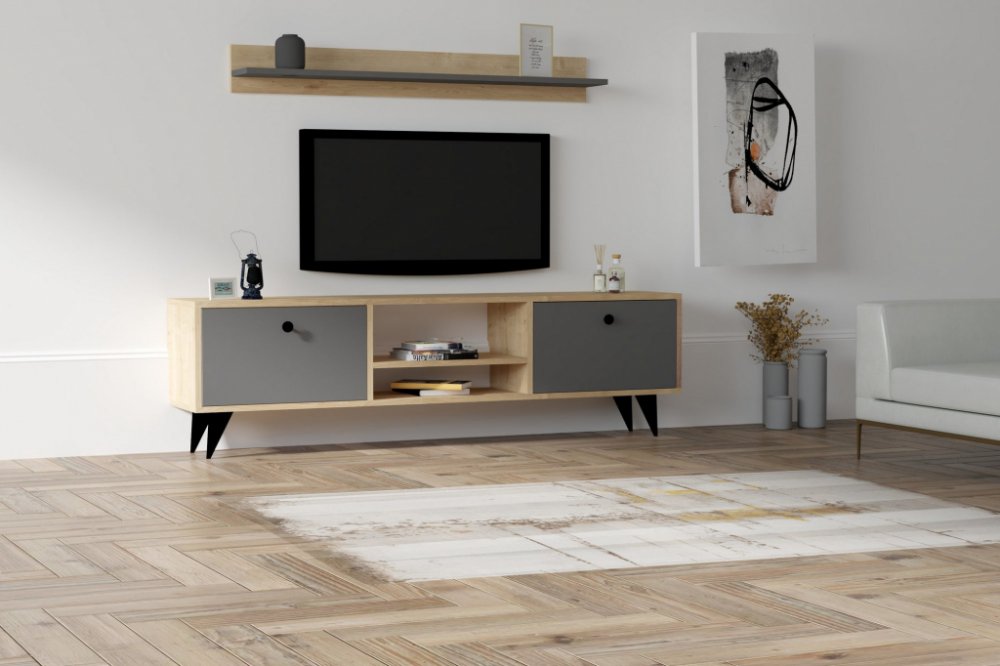 Televizní stolek SLIVA má tělo tvořené několika regály částečně uzavřené antracitovými dvířky a tytéž dekory se objevují i na nástěnné polici náležící ke stolku.