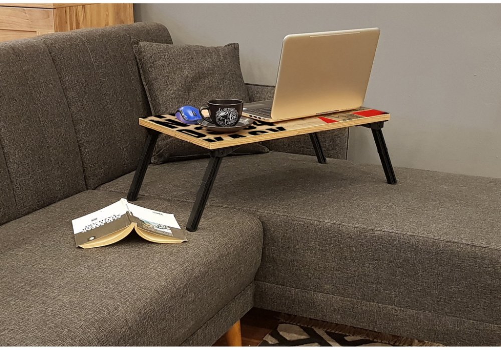 Stolek pod notebook GUSTO má skládací černé nožky a je vyrobený v dekoru borovice atlantic barvě s barevným potiskem.