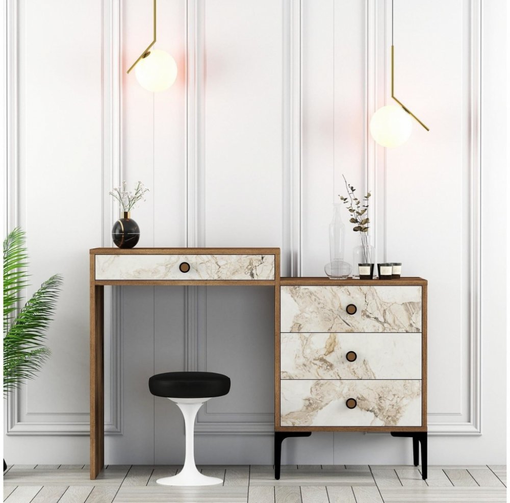 Proměňte svou ranní rutinu s naším moderním toaletním stolkemZačněte svůj den s naším stylovým a funkčním toaletním stolkem. Tento stolek je navržen v moderním a neotřelém pojetí a dodá vaší ložnici nebo šatně nádech elegance. Jeho kovové nohy inspirované industriálním stylem mu dodávají jedinečný a moderní vzhled, který na vás jistě zapůsobí.Zažijte bezkonkurenční odolnost a kvalituNáš toaletní stolek je vyroben ze 100% melaminované dřevotřísky a je navržen tak, aby vydržel. Tloušťka 18 mm zajišťuje robustnost a stabilitu, zatímco plastová rukojeť poskytuje elegantní povrch. Buďte si jisti, že tento stolek obstojí ve zkoušce času.Velký úložný prostor pro všechny vaše kosmetické potřebyDíky svým prostorným rozměrům 124 cm na šířku, 84,7 cm na výšku a 40 cm do hloubky nabízí náš toaletní stolek dostatek místa pro všechny vaše kosmetické potřeby. Vše má své místo, od paletek s make-upem až po produkty péče o pleť. Barevná kombinace ořechové a bílé barvy dodá každému pokoji nádech sofistikovanosti.Pozvedněte svůj styl díky nastavitelným kovovým nohámKovové nohy našeho toaletního stolku zajišťují nejen stabilitu, ale také mu dodávají nádech industriálního šarmu. Díky výšce nohou 17,8 cm můžete stolek snadno nastavit do požadované výšky pro optimální pohodlí při líčení.Technické detaily:Materiál: 100% dřevotříska potažená melaminemTloušťka: 18 mmPlastová rukojeť pro snadné otevírání a zavíráníKovové nohy pro větší stabilitu a stylRozměry komody: šířka: 124 cm, výška: 84,7 cm, hloubka: 40 cmVýška nožiček: 17,8 cmBarva: ořech a bíláVyrobeno v Turecku Popis. Moderní design a jednoduché linie jsou to, co letí. Při výrobě byly použity prvotřídní materiály. Povrchová úprava 100% melamin Rozměry: tloušťka: 18 mm, plastové úchytky kovové nohy, rozměry komody: šířka: 124 cm, výška: 84,7 cm, hloubka: 40 cm, výška nohou: 17,8 cm Doplňující informace: Vnitřní stěna komody je z nerezové oceli: Počet balení: 2 Parametry balení: 90 x 45,5 x 21,5 cm / 37,3 kg (1 ks), 24 x 19 x 17 cm / 2,8 kg (1 ks) Tento boční stolek vám nejen poskytne další úložný prostor, ale také dodá vašemu pokoji designový nádech. Díky různým funkcím a krásnému designu je tento stolek nezbytnou součástí vaší elegantní domácnosti. 100% melaminem potažená dřevotřísková deska Tloušťka: 18 mm Plastová úchytka Kovové nohy Komoda Rozměry: Šířka: 124 cm Výška: 84,7 cm Hloubka: 40 cm Výška nohou: 17,8 cm