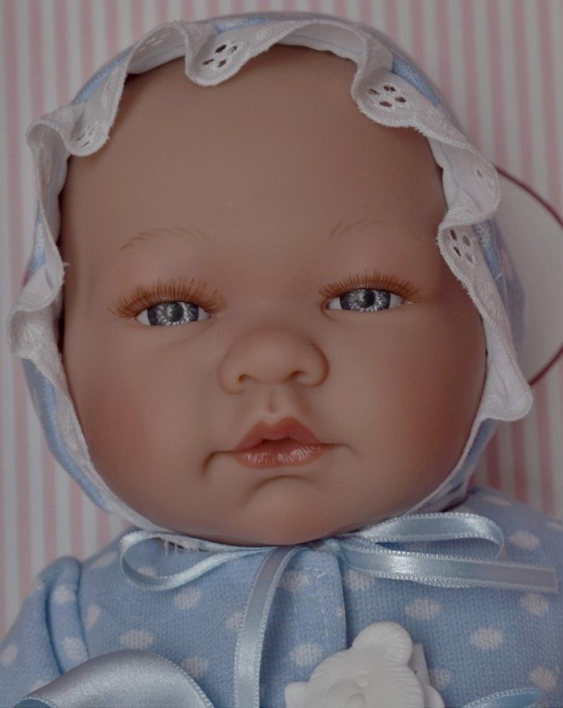 Krásné realistické miminko chlapeček Pablo v krajkovém oblečku byl vyroben firmou Asivil ve Španělsku. Miminko je 43 cm dlouhé, má tvrdé-vinylové tělíčko, propracované do všech detailů, včetně pohlaví. Má nemrkací akrylové oči a nalepené řasy.