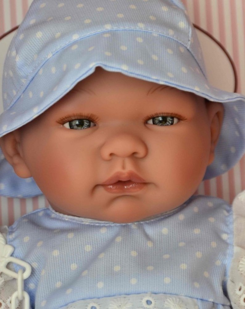 Krásné realistické miminko chlapeček Pablo v puntíkatém kloboučku byl vyroben firmou Asivil ve Španělsku. Miminko je 43 cm dlouhé, má tvrdé-vinylové tělíčko, propracované do všech detailů, včetně pohlaví. Má nemrkací akrylové oči a nalepené řasy. Pablo má dudlík na řetízku, který jde do pusinky a drží tam.