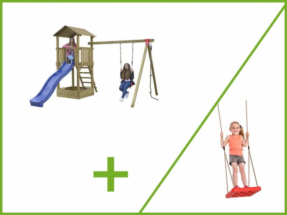 Set je dodáván včetně skluzavky (modrá), pískoviště (bez písku), houpačky (červená), lana na šplhání a madel.