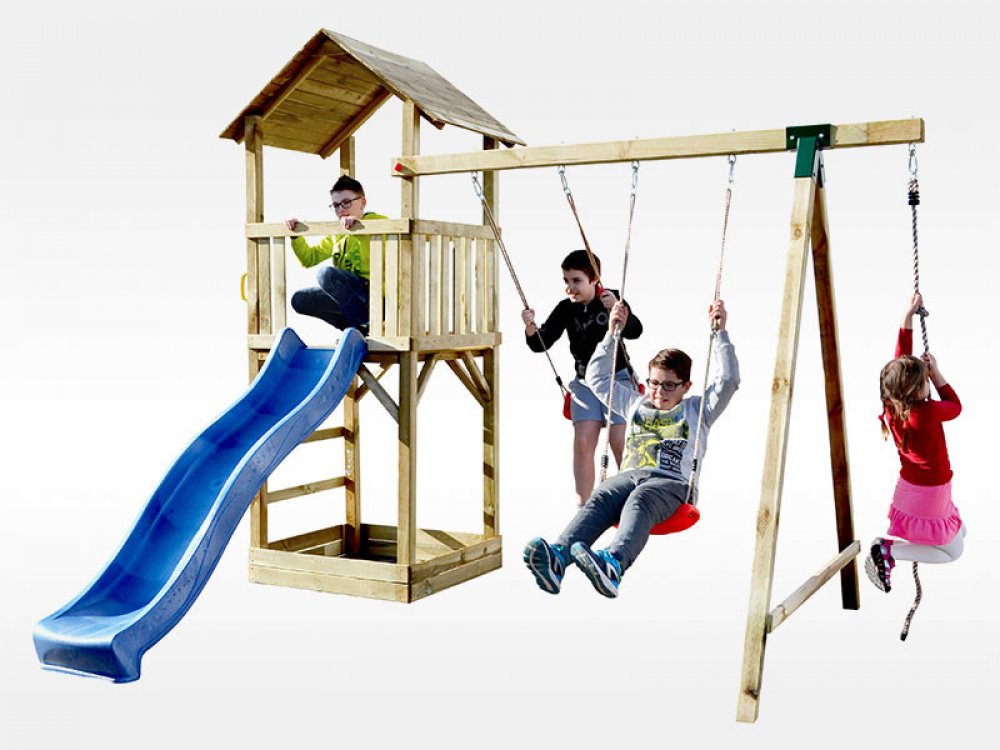 Tuto multifukční dětskou hrací věž si Vaše děti určitě zamilují. Na hlavní věž s dřevěnou stříškou děti vylezou pomocí žebříku a dolů se pak dostanou sklouznutím po krásné skluzavce. Další zábavu si pak užijí na houpačce a můžou si i zašplhat na laně. Jednoduše ideální zábava pro každé dítě.