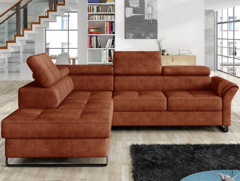 Komfortní rohová sedací souprava na černé kovové podnoži je inspirována městským industriálním stylem. Očalouněna atraktivní látkou v optice broušené kůže a v rezavém odstínu. Pohodlné sezení navíc doplňují funkce polohování zádových opěrek, rozklad na lůžko i praktický úložný prostor pod levým otomanem. - konstrukce: dřevo, dřevotříska, překližka, kov - jádro: vlnovcové pružiny, polyuretanové pěny, čalounický flís - potah: látka Salvador 7 – měkká látka v optice broušené kůže, barva rezavá (složení: 100% polyester, otěruvzdornost: 130.000 cyklů, speciální vlastnosti: zvýšená voděodolnost – tkanina je potažena speciální ochrannou vrstvou, která vytváří hydrofobní povlak, který chrání před rychlým přechodem tekutin – to zabraňuje okamžité absorpci vody skrz tkaninu, čímž se kapalina kondenzuje na povrchu materiálu, díky tomu máte čas použít měkký hadřík nebo papírový ručník k jemnému odfiltrování rozlité kapaliny) - včetně potažení zadní části (možné umístění i v prostoru) - dekorativní prošev potahu sedáku (dvojitý šev v barvě potahu) - rohový půdorys – levý roh (otoman umístěn vlevo) - pravá boční područka (zaoblená) - sedák: pohodlně měkký - opěrák: pohodlné vypolstrování oblasti beder - 3 x široká opěrka zad v horní části opěráku – s polohovatelnou funkcí (nastavení libovolné polohy, opěrky zajistí komfortní opření horní části zad a díky možnosti nastavení jejich sklonu si tak můžete přizpůsobit styl sezení podle Vaší individuální potřeby) - celková výška – dle polohy zádové opěrky: 77-97 cm - podnož: kovový profil, černý lak, výška podnože 10 cm - funkce rozkladu na příležitostné lůžko: plocha 122x192 cm (výsuvný typ rozkladu, konstrukce kov/dřevo, na kolečkách pro snazší manipulaci, látkové madlo, plocha lůžka potažena látkou) - úložný prostor (pod otomanem, vyklápěcí kovová konstrukce) - inspirována industriálním stylem - solidní zpracování - dodáváno v částečném demontu