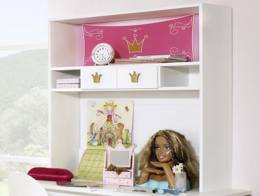 Úložný nástavec na psací stůl z dětské kolekce Kate si zamilují malé i velké princezny. Nábytek s růžovými aplikacemi a motivem princeznovské koruny je skvělou inspirací pro zařízení dětského pokoje pro holky. Dopřejte tak svým dětem prožít si svůj sen v jejich vlastním dětském království. - dětský nástavec na psací stůl z programu Kate - materiál: dřevotříska, kov, plast - barva: bílý mat/motivy - dekorativní princeznovské potištěné aplikace: růžové/bílé/zlaté motivy - úchyty: tvar princeznovské koruny, plast, barva zlatý mat - 1 x horní široká přihrádka - 2 x menší úložná přihrádka - 2 x úložná zásuvka (kovové boční pojezdy) - spojovací zadní lišta (pro zpevnění) - vnitřní prostory v dekoru Texline (optika textilního plátna) - oblíbený princeznovský styl - skvělá inspirace pro zařízení dětského pokoje pro holky - pro umístění na psací stůl, případně komodu (konstrukci doporučujeme ukotvit pomocí zadního spojovacího kování) - kvalitní zpracování - vyrobeno v Německu - dodáváno v demontu