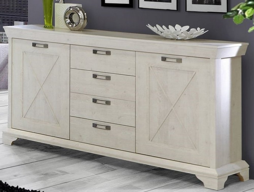 Široká komoda z romantické kolekce Kashmir upoutá na pohled. Horní tvarovaná římsa, široké orámování i světle krémové tóny dekoru bělené borovice spolu vytváří působivou atmosféru. Nábytek je ideální pro zařizování interieru v tradičním, romantickém, provensálském nebo rustikálním stylu. - široká komoda z programu Kashmir - materiál: MDF, dřevotříska 15 mm/22 mm (ABS hrana horní desky), kov, plast - dekor: bělená borovice - dekor bělené borovice je typický světle krémovými tóny s prosvítajícími letokruhy a jemně strukturovaným povrchem - úchyt: zaoblený kovový profil, kov s efektem patiny - podnož: široký dolní okrasný rám/zaoblené frézované nohy - mohutná optika širokých bočních rámů - široká horní okrasná římsa - okrasné překřížené lišty - stylový nábytek (do interieru v tradičním, romantickém, provensálském nebo rustikálním stylu) - celková šířka: 178 cm - 1 x levé dveře (úložný prostor, 1 x police - výškově nastavitelná) - 4 x zásuvka (kovové boční pojezdy) - 1 x pravé dveře (úložný prostor, 1 x police - výškově nastavitelná) - doporučená nosnost horní plochy komody do 20 kg - solidní zpracování - dodáváno v demontu