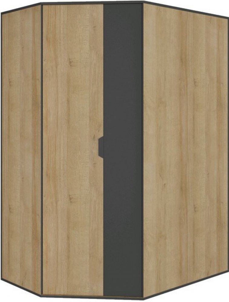 Rohová šatní skříň z programu Nano obsahuje praktické úložné prostory a zaujme svým vzhledem v kombinaci útulného dubového dekoru a grafitové barvy. Hodí se pro vybavení pokoje dětí, teenagerů i dospělích. - rohová šatní skříň z programu Nano - materiál: dřevotříska 16 mm (ABS hrany) - dekor: dub riviera/grafit mat - úchyty: zešikmený tvar, plast (grafit mat) - nožky: přízemní kluzáky - 2 x otočné dveře - členění vnitřního prostoru: 2 x vnitřní blok - levý vnitřní blok: 4 x police - střední vnitřní blok: 3 x police, 2 x zásuvka - pravý vnitřní blok: otevřený úložný prostor, 1 x závěsná šatní tyč z kovu - univerzální - kratší a delší stranu skříně lze univerzálně smontovat na pravou/levou stranu - dodáváno bez osvětlení - dodáváno v demontu
