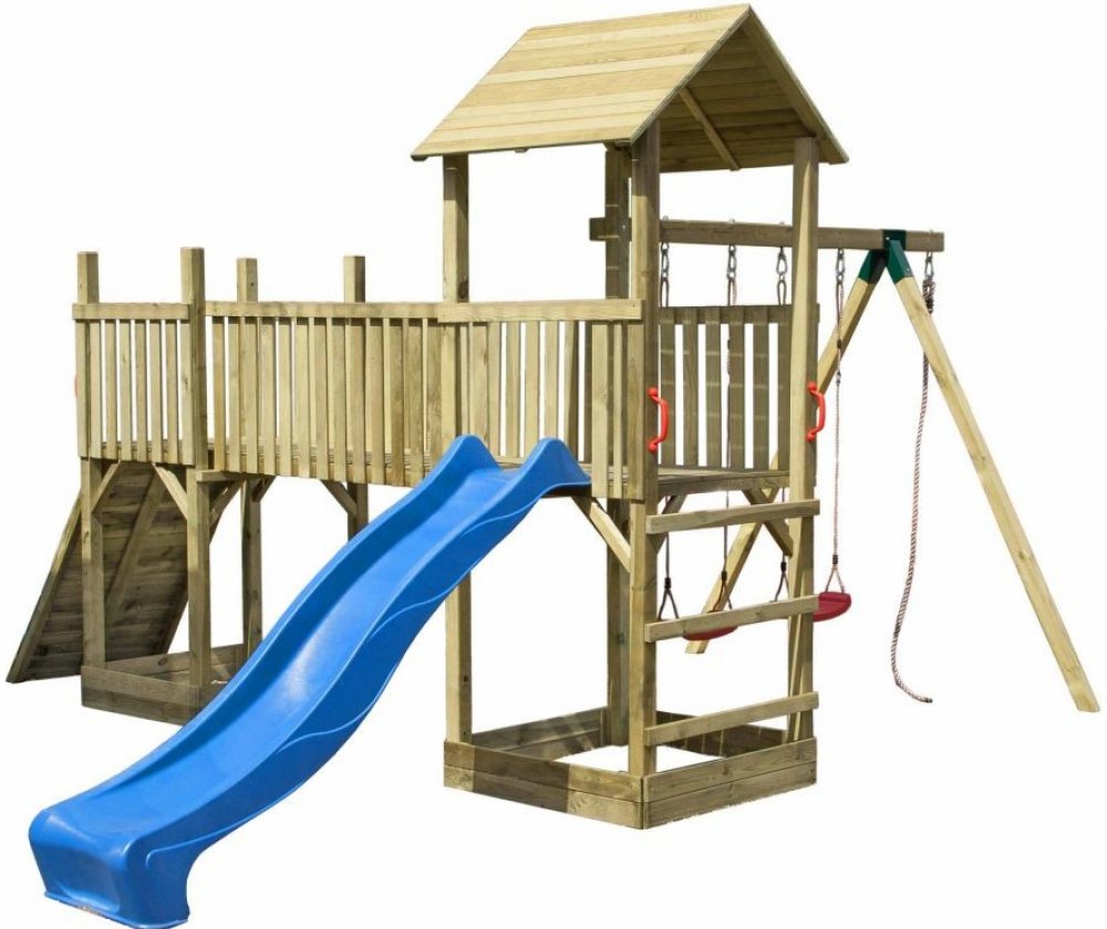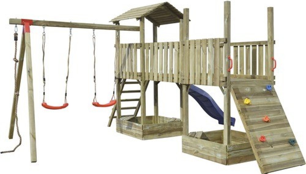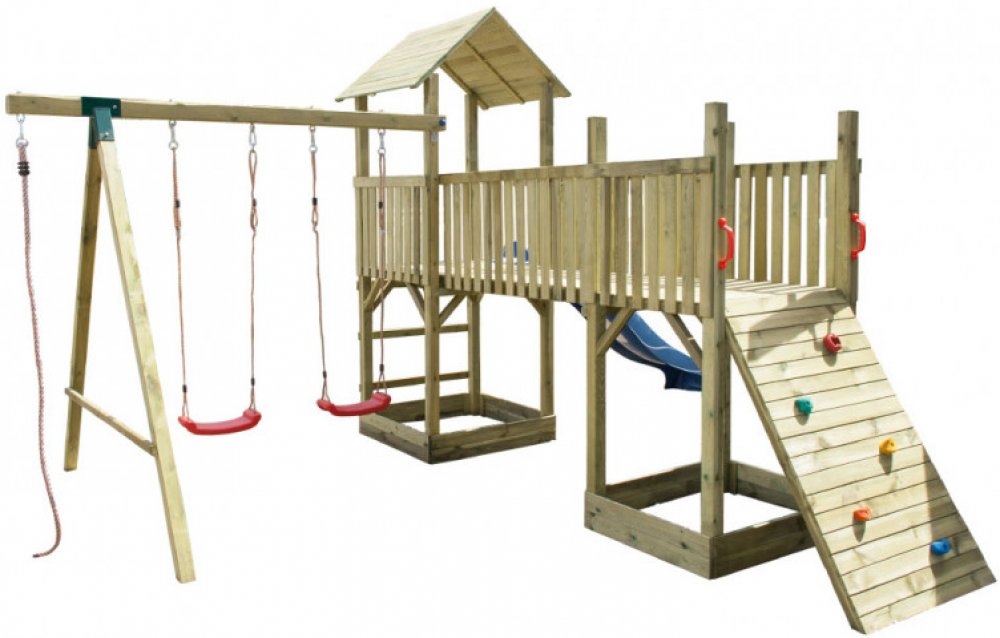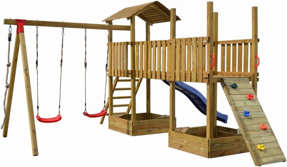Set je dodáván včetně skluzavky (modrá), 2 houpaček (červená), 2 pískovišť (bez písku), lana na šplhání a lezecké stěny s lezecími kameny (mix barev) a madel (červená).