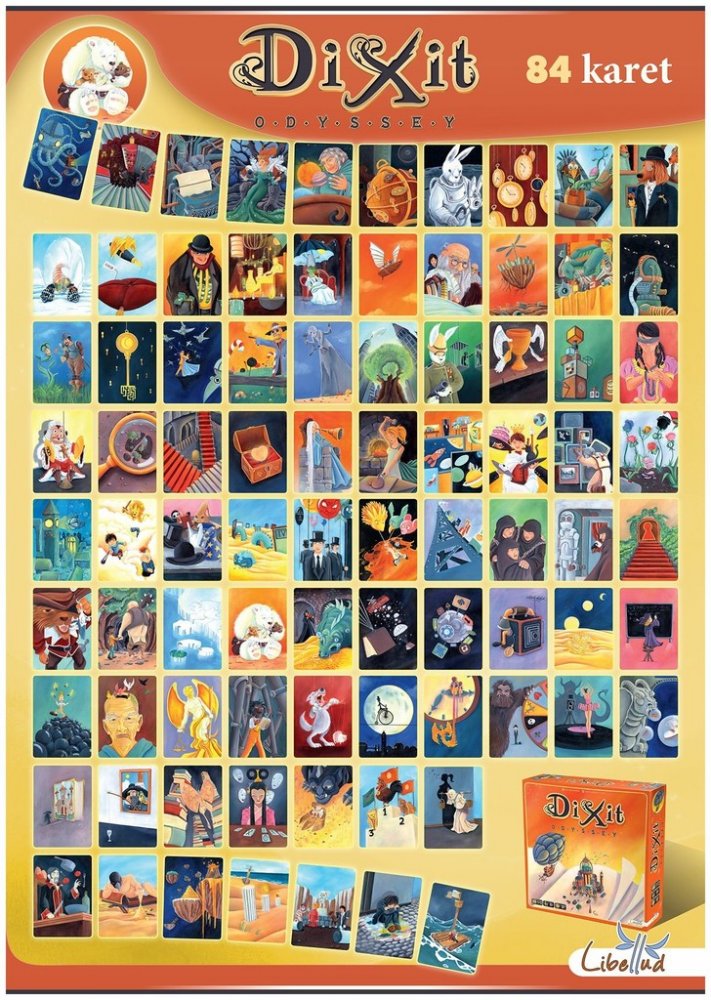 Samostatně hratelné pokračování série hry Dixit. Jeden obrázek řekne více než tisíc slov! Dixit Odyssey - samostatně hratelné pokračování rodinné hry ze série Dixit nyní až pro 12 hráčů. Vydejte se do nových pohádkových světů a vyzkoušejte nová pravidla. K této hře nepotřebujete původní hru, ale pokud toužíte po rozmanitější a delší hře, můžete ji spojit s dalšími hrami ze série Dixit. Nádherně ilustrovaná hra pomáhá dětem rozvíjet fantazii a zároveň baví i dospělé. Jak hrát? Každý na začátku hry obdrží 6 karet. Hráč, který je na řadě, se stává "vypravěčem". Ze svých karet si vybere jednu, kterou popíše slovem, větou, frází nebo písní. Ostatní hráči vybírají ze svých karet tu, která nejvíce odpovídá danému popisu. Následně se vybrané karty vyloží na stůl a všichni kromě "vypravěče" hlasují, která z vyložených karet byla ta popisovaná. Správné odpovědi jsou hodnoceny posunováním dřevěných králíčků - figurek - po bodovací stupnici, která je vtipně umístěna uvnitř krabice od hry. Hra obsahuje: