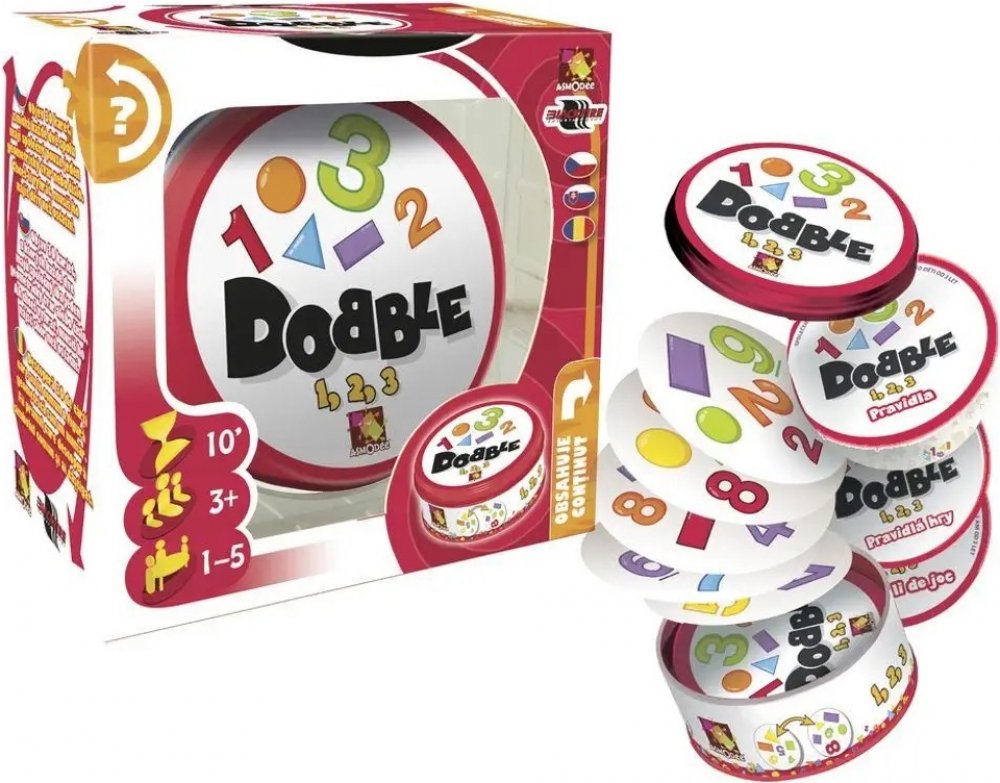 Zábavná dětská hra DOBBLE 1-2-3 rozvíjí rychlost, postřeh a reflexy. Na každých dvou kartách je vždy jeden společný tvar nebo číslo – kdo ho najde dřív, vyhrává. Hra je v češtině i slovenštině, má jednoduchá pravidla a praktickou plechovou krabičku.Hledáte rychlou a chytlavou rodinnou hru pro nejmenší? Dobble 1-2-3 přináší bleskové souboje v hledání shodných symbolů – geometrických tvarů a čísel. ...