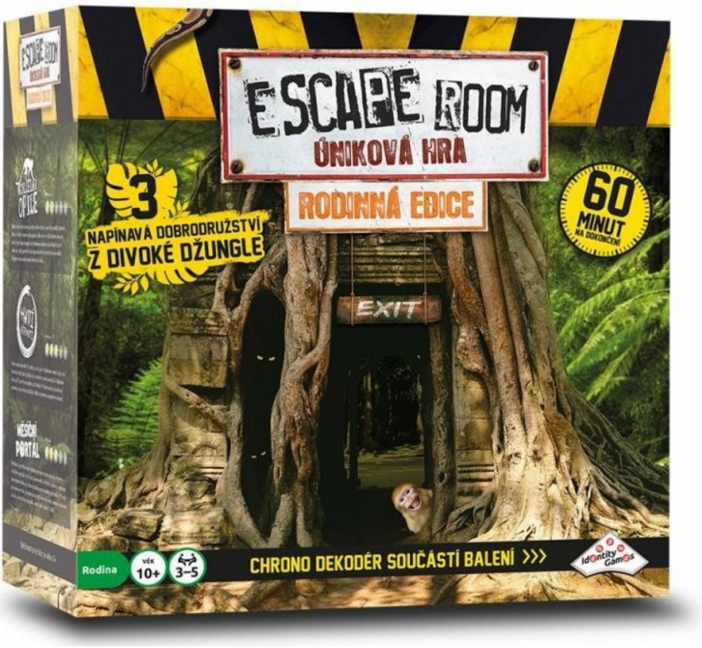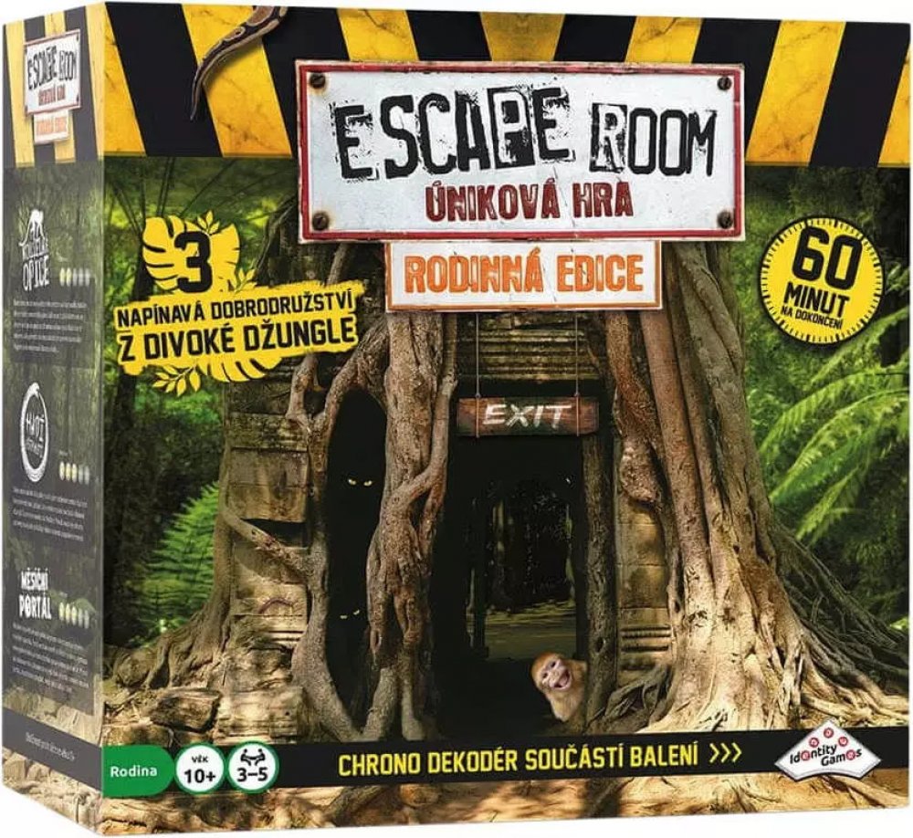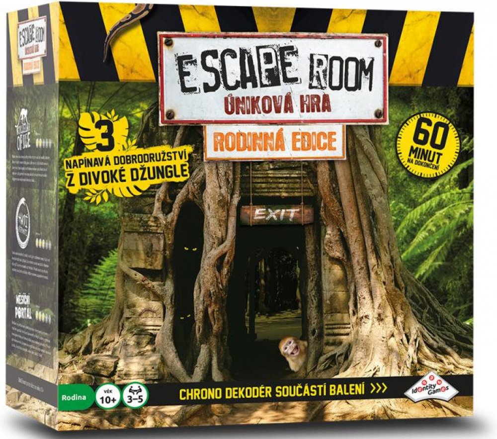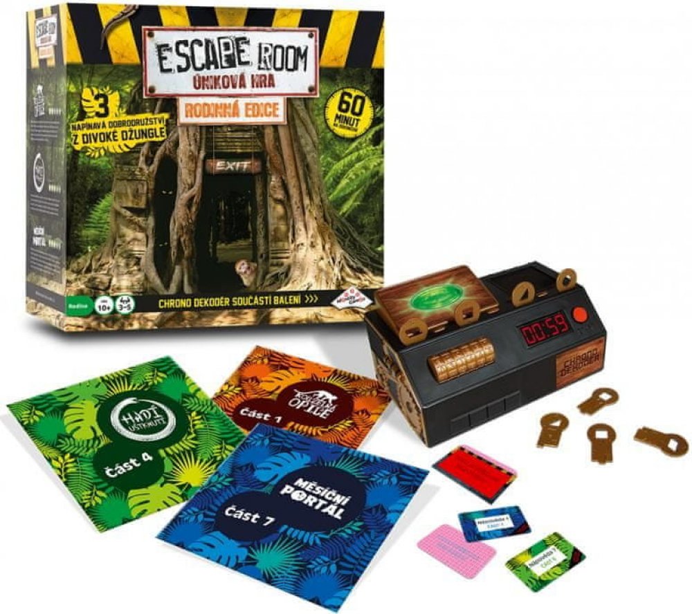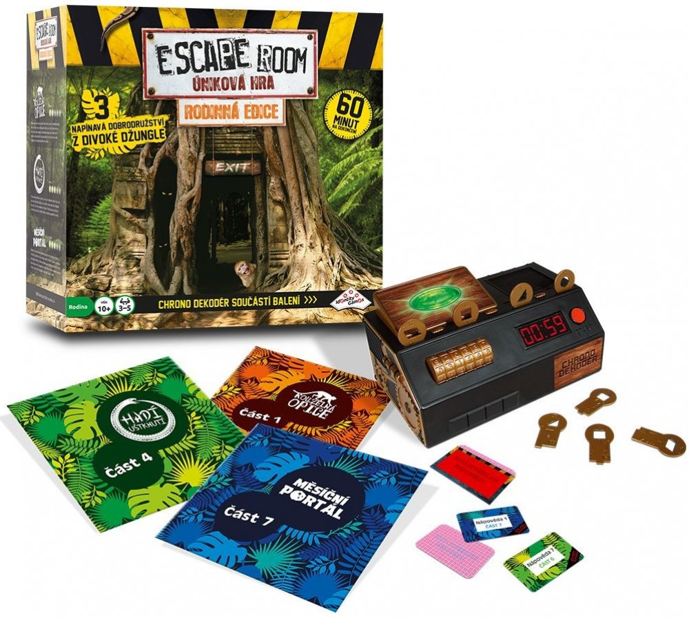 Stejně jako v případě ostatních verzí hry Escape Room po celém světě jste i tady „uvězněni“ a cílem je najít během 60 minut kódy pro „útěk“. Kódy nacházíte řešením hádanek a rébusů. Používejte mozek! Nezbytná je také týmová práce, dostatečná komunikace, dobré nápady, tvořivost, logika a smysl pro detail! Toto balení obsahuje 3 napínavé scénáře, které jsou navzájem příběhově propojené. Každý scénář se skládá ze 3 částí. V každé části musíte najít správnou kombinaci čtyř klíčů z šestnácti možných. Klíče zasunujete do Chrono–dekodéru. Najděte 3 správné kombinace klíčů během 60 minut a vyhrajte hru. Společně buď vyhráváte nebo prohráváte... Začínáte otevřením obálky a přečtením úvodního příběhu záhady. Vyřešení záhady je samozřejmostí. Navíc obálky obsahují různé druhy šifer, které musíte rozluštit, abyste odhalili správnou kombinaci klíčů. Každý hráč si najde vlastní typ šifry, do které se může ihned pustit. Každé kolo budete čelit novým elementům na hracím stole. Budete nalézat nejednu stopu vedoucí k rozluštění celé záhady. Jste připraveni na tuto výzvu? Obsah balení: elektornický Chrono dekodér, dekodér nápověd, 16 klíčů, 3x 8 karet s nápovědou, návod, 3 různé scénáře: Magická opice, Hadí uštknutí a Městíční portál Vhodné pro děti od 10 let.