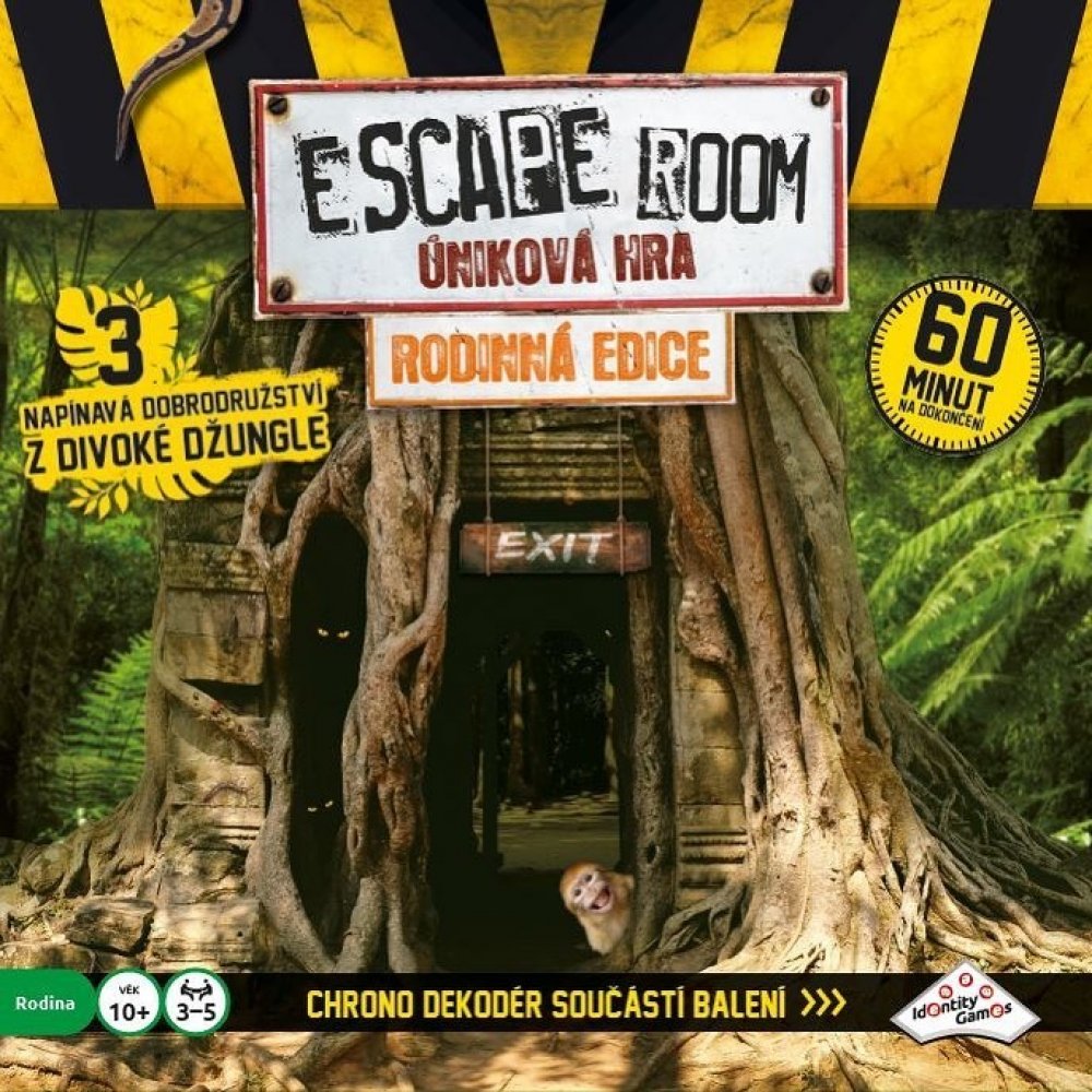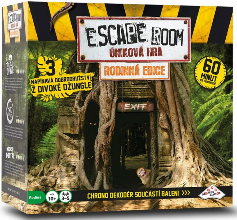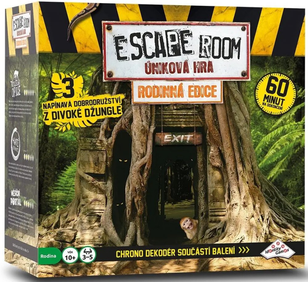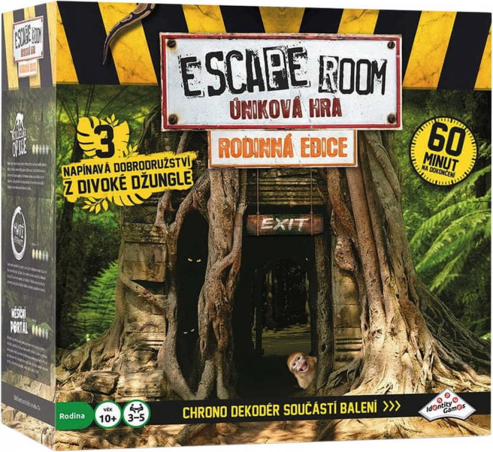 Stejně jako v případě ostatních verzí hry Escape Room po celém světě jste i tady „uvězněni“ a cílem je najít během 60 minut kódy pro „útěk“. Kódy nacházíte řešením hádanek a rébusů. Používejte mozek! Nezbytná je také týmová práce, dostatečná komunikace, dobré nápady, tvořivost, logika a smysl pro detail! Toto balení obsahuje 3 napínavé scénáře, které jsou navzájem příběhově propojené. Každý scénář se skládá ze 3 částí. V každé části musíte najít správnou kombinaci čtyř klíčů z šestnácti možných. Klíče zasunujete do Chrono–dekodéru. Najděte 3 správné kombinace klíčů během 60 minut a vyhrajte hru. Společně buď vyhráváte nebo prohráváte... Začínáte otevřením obálky a přečtením úvodního příběhu záhady. Vyřešení záhady je samozřejmostí. Navíc obálky obsahují různé druhy šifer, které musíte rozluštit, abyste odhalili správnou kombinaci klíčů. Každý hráč si najde vlastní typ šifry, do které se může ihned pustit. Každé kolo budete čelit novým elementům na hracím stole. Budete nalézat nejednu stopu vedoucí k rozluštění celé záhady. Jste připraveni na tuto výzvu? Obsah balení: elektornický Chrono dekodér, dekodér nápověd, 16 klíčů, 3x 8 karet s nápovědou, návod, 3 různé scénáře: Magická opice, Hadí uštknutí a Městíční portál Vhodné pro děti od 10 let.