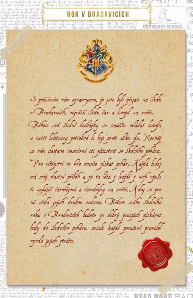 S potěšením vám oznamujeme, že jste byli přijati na školu čar a kouzel v Bradavicích. Během své školní docházky se naučíte ovládat kouzla a vařit lektvary potřebné k boji proti silám zla. Rovněž se vám dostane nesmírné cti zúčastnit se školního poháru.