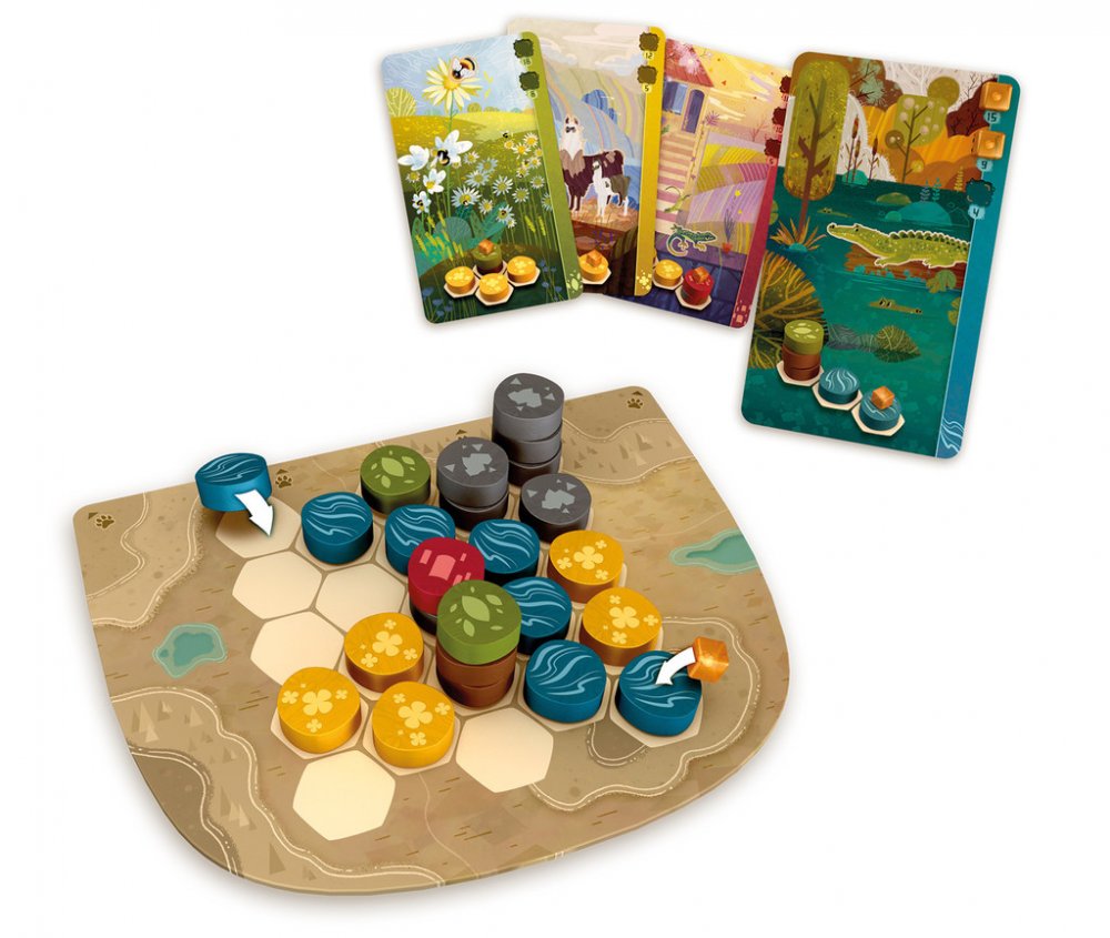 Umisťování žetonů (Tile Placement): Hráči umisťují žetony, které rozšiřují krajinu a definují biotopy (barvy).