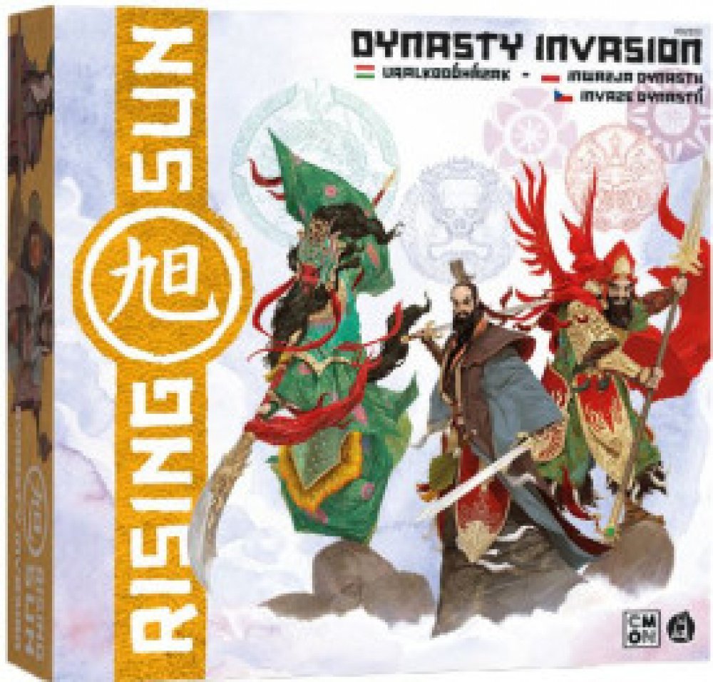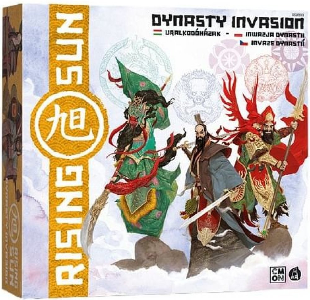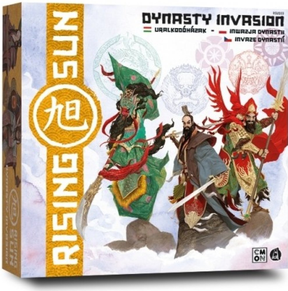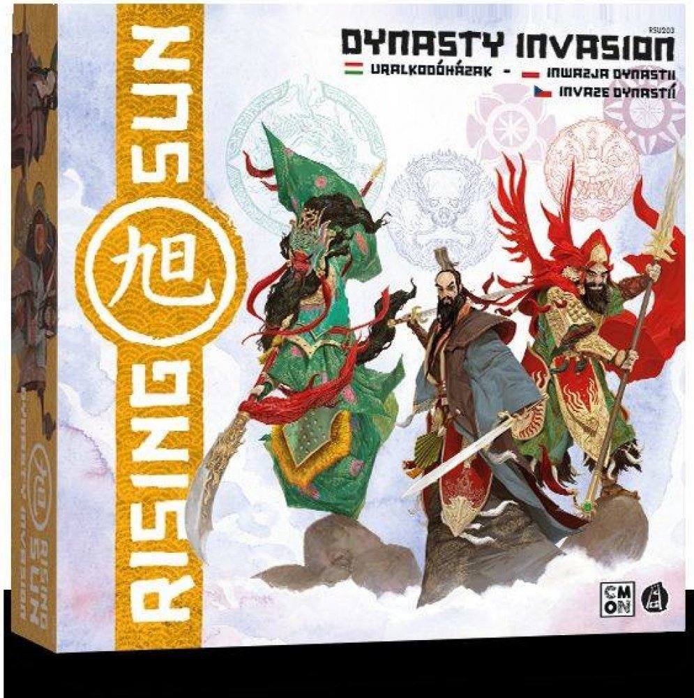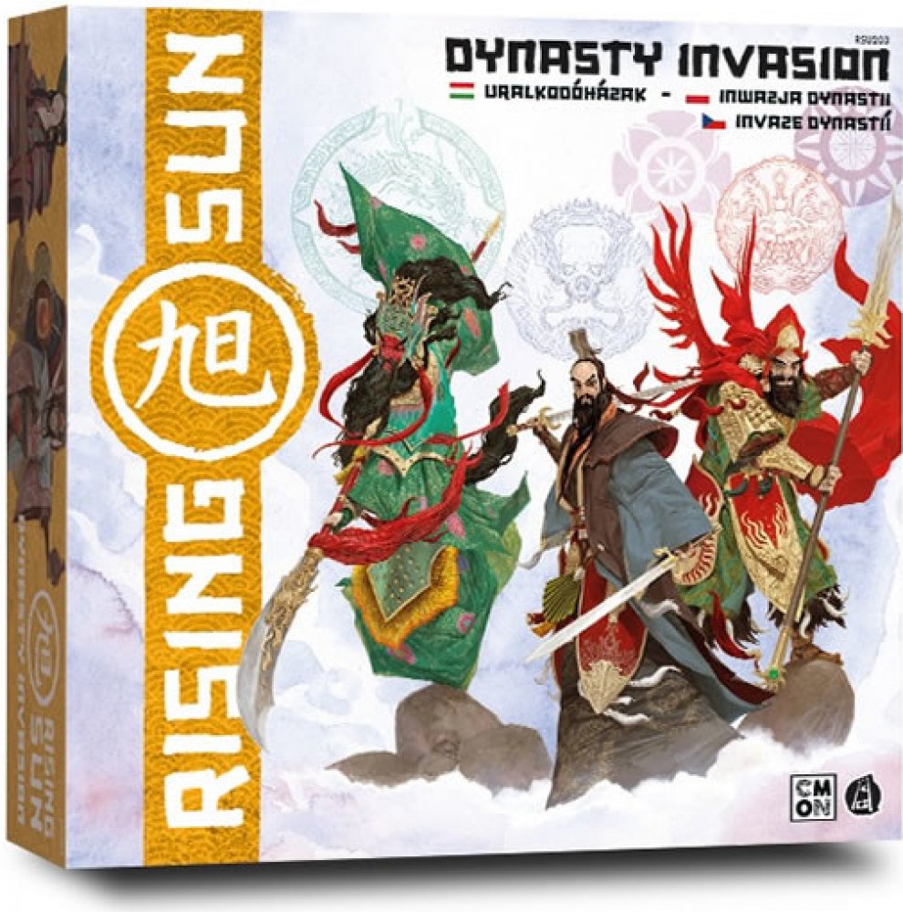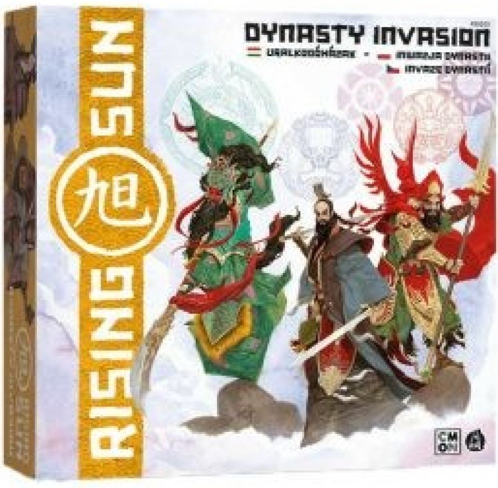 Invaze dynastií je rozšíření pro monumentální figurkovou hru Rising Sun z prostředí feudálního Japonska, které do hry přináší dva nové klany - Sun a Moon. Ty přišly zdaleka, přivedly si svá monstra a rovněž materiál pro šestého hráče.Podivný příliv omývá japonské pobřeží. Do země připlouvají dva nové klany, které hodlají dát své schopnosti všanc, aby zformovaly zemi podle svých představ. Jsou to klany tak protikladné, jak jen to lze.Devízou klanu Slunce je čest. Kdykoliv tento klan vyhraje díky svému postavení na žebříčku cti, získá minci a vítězný bod. Naopak, ten kdo souboj prohrál, obojí ztrácí. Klan Měsíce stojí na odvrácené straně světla - jeho čest je nejnižší ze všech. Za to vyniká svou bojovou silou. Jeho figury mají sílu dvou jednotek.Klany, protože přicházejí z dalekých krajin a neznají dobře japonskou mytologii, nemohou využívat klasických monster. Přivážejí si však monstra vlastní, tzv. Lucky Gods. Ta jsou dostupná pouze jim a nikomu dalšímu.Tato hra je pouze rozšíření. K jejímu hraní je nutné vlastnit původní Rising Sun.Hra obsahuje:10 miniatur klanu Sun10 miniatur klanu Moon2 klanové zástěny7 miniatur Lucky Gods4 plastové značky klanů1 žeton politika/válka22 podstavců10 žetonů22 karetdesku pro 6. hráče