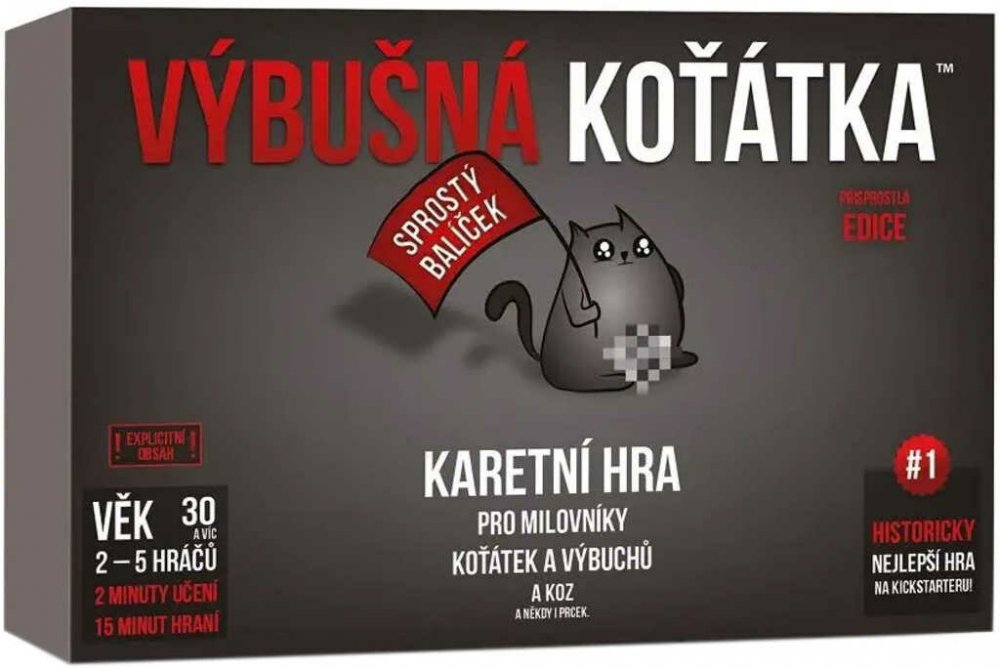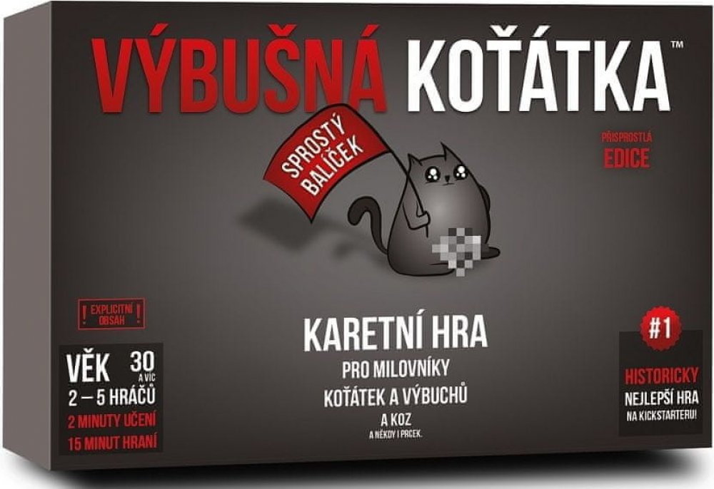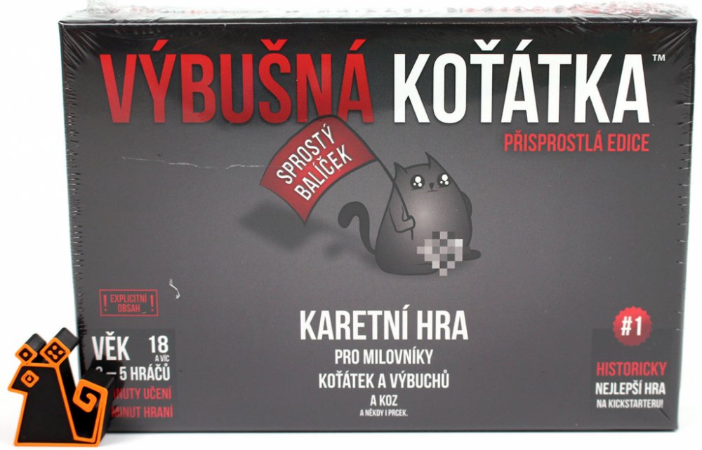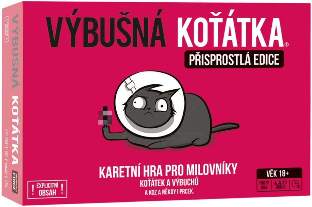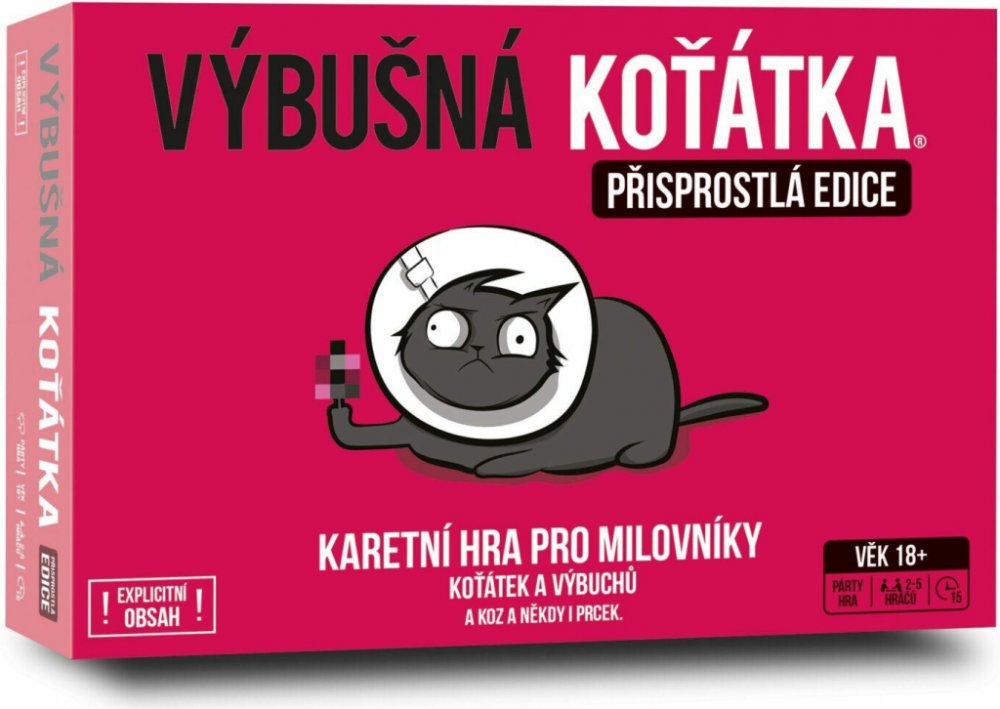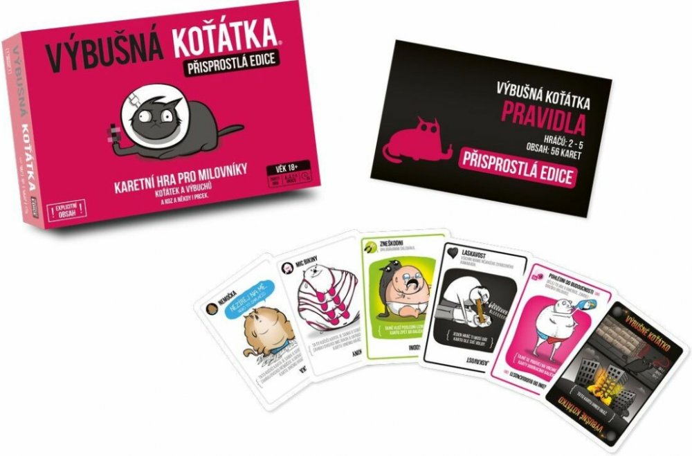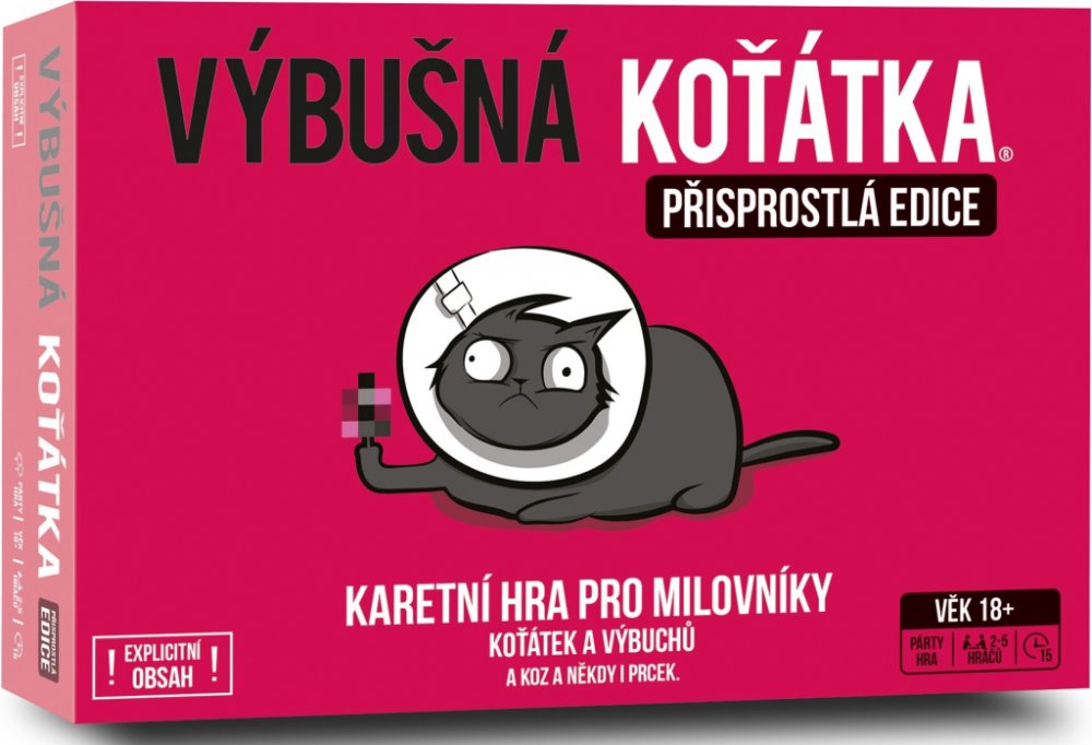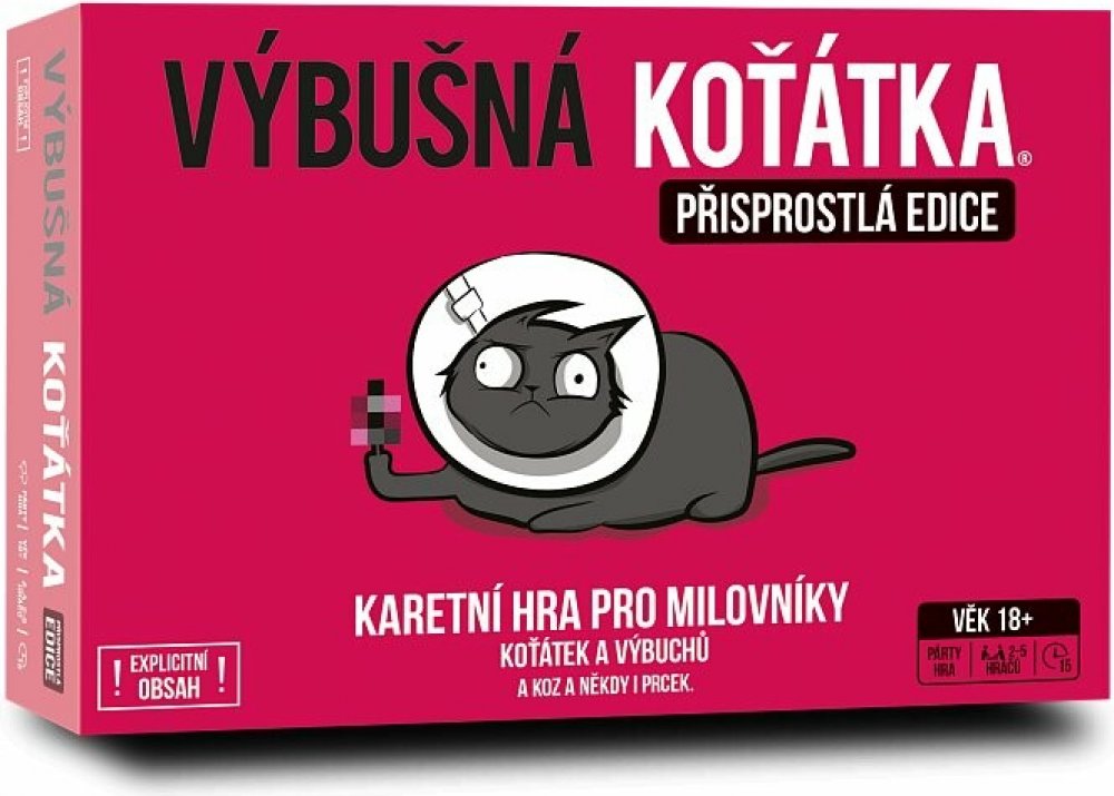 Výbušná koťátka: Přisprostlá edice přináší vše, co máte na klasické verzi rádi – výbuchy, podrazy, napětí a strategii – ale přidává k tomu pořádnou dávku dospělého humoru. Tahle verze je určena všem, kteří se nebojí trochu oplzlosti a nebojí se smát na hranici vkusu. Jde o plnohodnotnou verzi populární hry, v níž si hráči dobírají karty, snaží se vyhnout výbušnému koťátku a zároveň škodit ostatním. Mechanika zůstává stejná: ruská ruleta s koťaty, ale tentokrát pořádně přikořeněná. Hra je stejně jednoduchá, svižná a chytlavá jako originál, ale díky nové grafice a tématu má úplně jiný, mnohem ostřejší šmrnc. Připravte se na to, že tahle verze není pro děti – ani pro slabé žaludky.