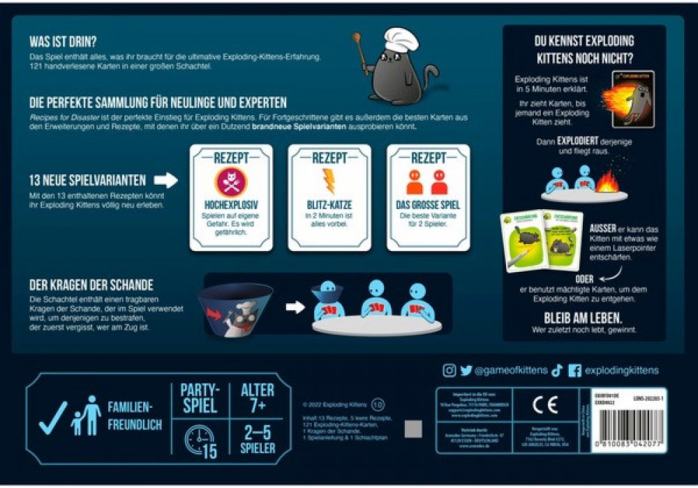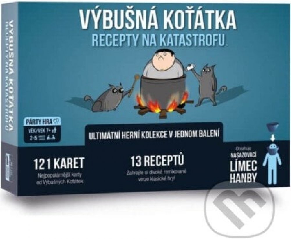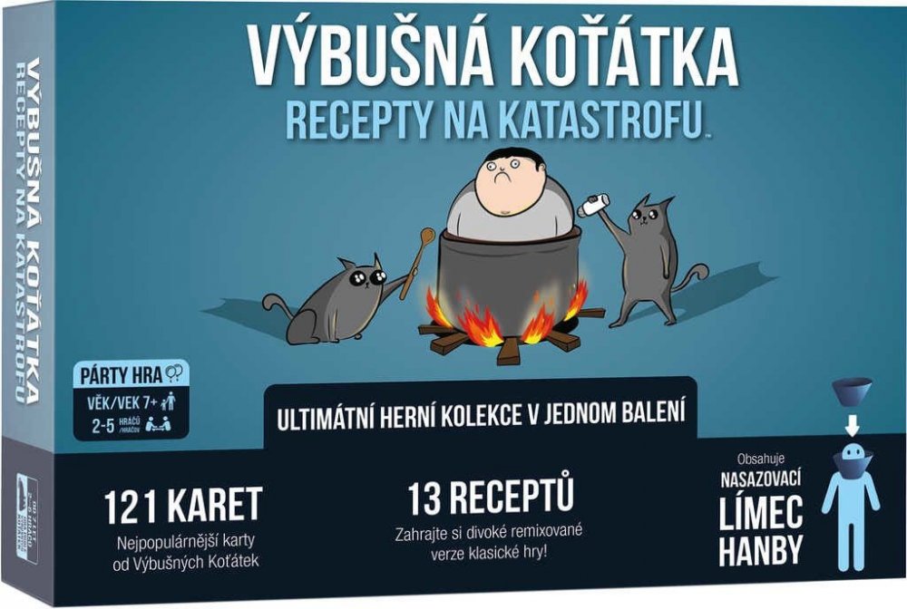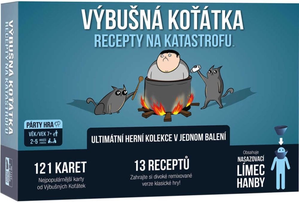 Recepty na katastrofu přinášejí vše, co začátečníci pro svou první hru Výbušných koťátek potřebují. Zkušenějším hráčům pak nabízejí výběr těch nejlepších karet z rozšíření hry spolu s brožurami receptů, díky kterým otevřete více jak tucet nových herních variant.