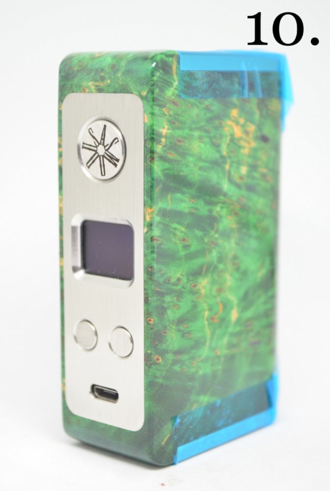 Tělo módu je zhotoveno z kvalitního akrylátu a většinu plochy pokrývá prvotřídní stabilizované dřevo, hned v několika jedinečných variacích. Tomu sekundují na pracovní straně dvě poziční tlačítka a dostatečně velké tlačítko žhavení, vhodně umístěné pro co nejpřirozenější stisk. Velmi esteticky přirozeně také působí zapuštěný závit 510 bez okruží na povrchu, mód tak osadíte jakýmkoli atomizérem s 510 závitem, aniž by kazil celkový dojem sestavy.