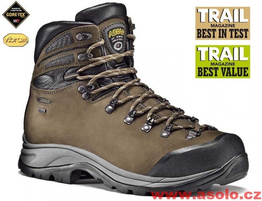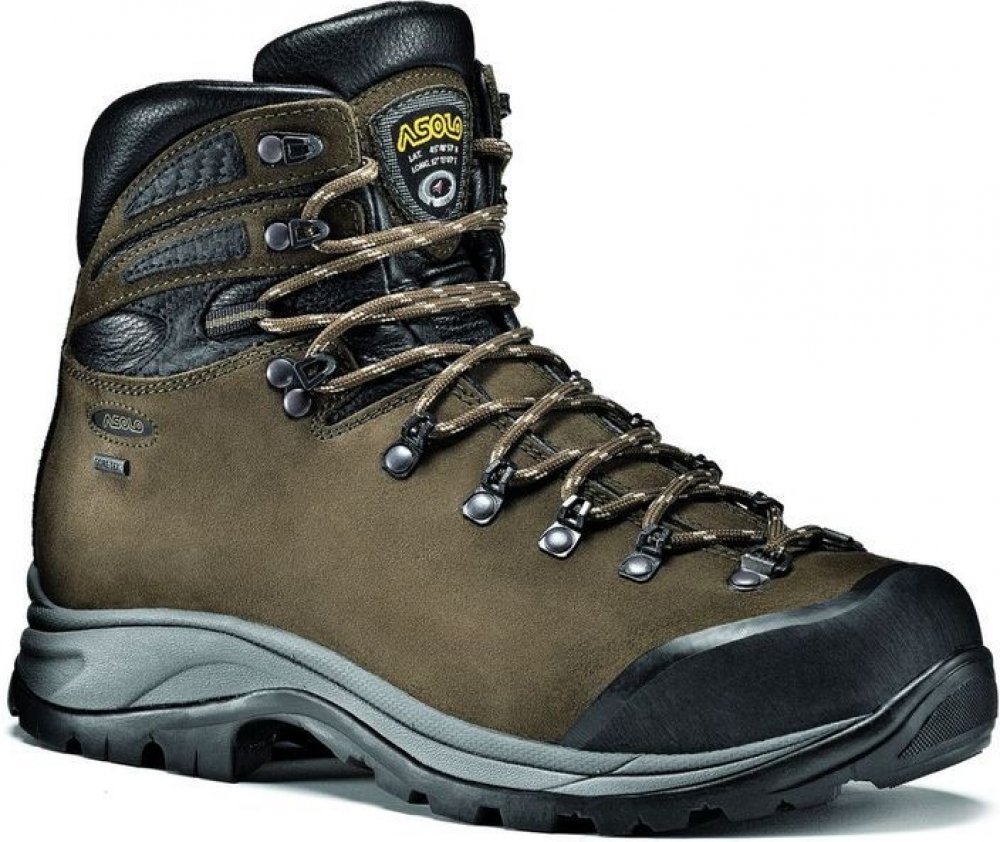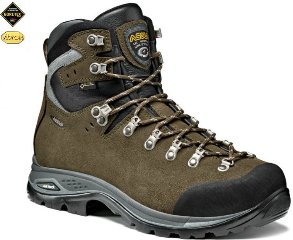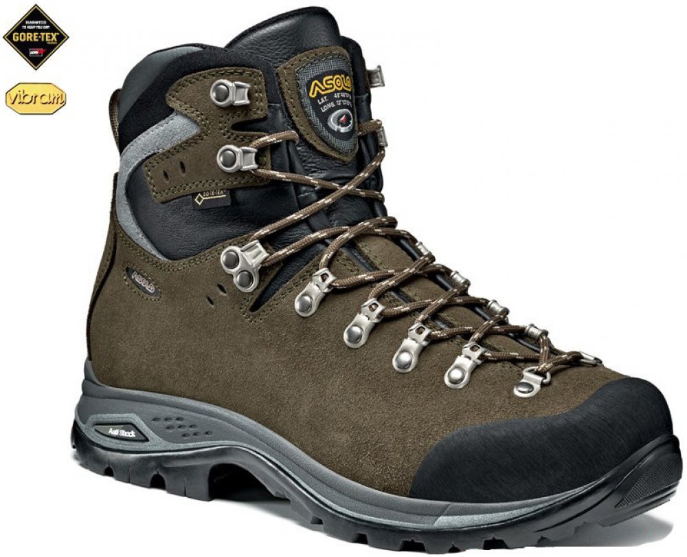 Asolo kotníkové kůže 655 g Gore-Tex na náročný horský terén na vícedenní turistiku hnědá pohorky Greenwood GV Gore-Tex, Vibram Megagrip jarní/podzimní na šněrování se střední výbavou na vysoce náročnou turistiku s obsázkou na špičce EVA Vibram
