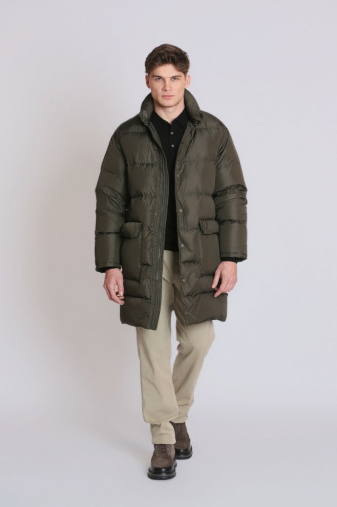 Pánský péřový kabát rovného střihu, jehož povrchový materiál a podšívka jsou tvořeny 100 % recyklovaným syntetickým vláknem. Jednobarevný design s praktickým stojáčkem u krku a odnímatelnou kapucí doplňuje zapínání na zip a cvočky. Nechybí našité kapsy s patkou a bočními otvory pro ruce. Materiálové složení s kvalitní výplní z kachního peří zaručuje dokonalou hřejivost, prodyšnost a příjemný pocit...