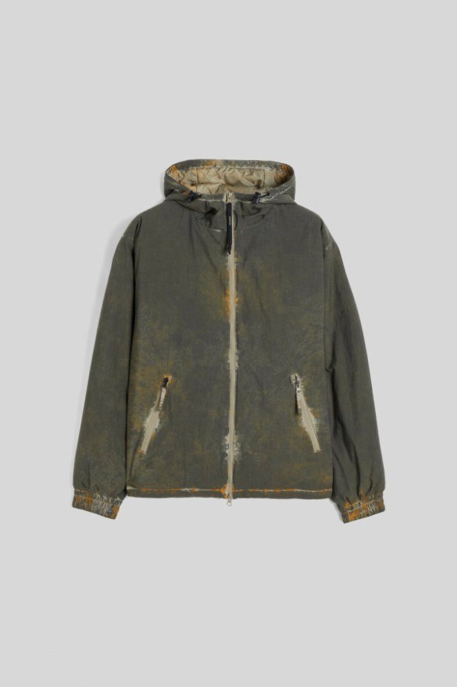 Pánská bunda rovného střihu, kterou zdobí speciální povrchová úprava paint ball s efektem potřísnění. Ležérní design s kapucí a zapínáním na dvoucestný zip doplňují boční kapsy se zipem a elastická manžeta na dlouhých rukávech. Interiér je opatřen jemnou nylonovou podšívkou, středně silnou vatovou výplní a vnitřním stahováním spodního lemu. Výborně kombinovatelný kousek, který stylově doladí váš outfit.