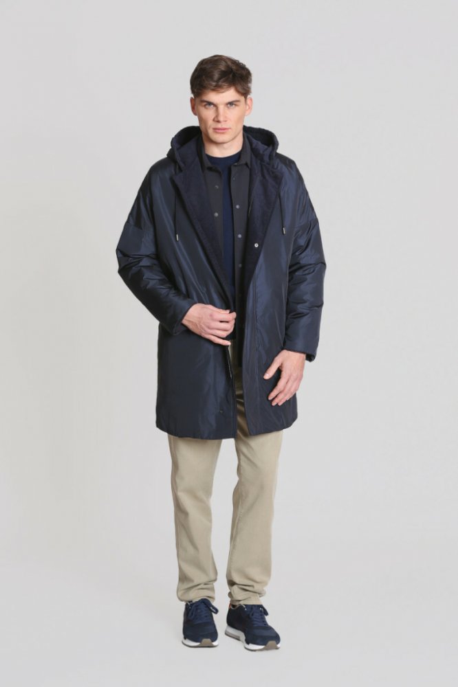Pánský kabát uvolněného střihu, jehož povrchový materiál z recyklovaného nylonu má vodoodpudivou úpravu. Jednobarevný design s posunutou linií ramen a skrytým zapínáním na zip překrytým légou doplňují boční kapsy s lemováním. Fixní kapuce je ozdobena sametovým podšitím a šňůrkou na stažení. Interiér je opatřen středně silnou vatovou výplní Thermore. Tento maximálně komfortní a výborně kombinovatel...
