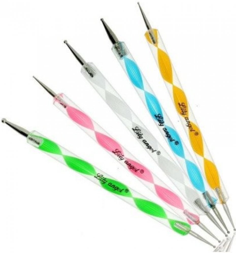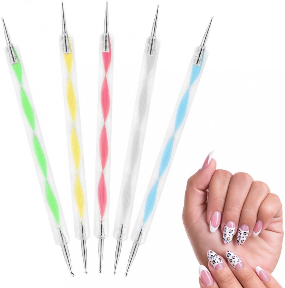 Pero na zdobení nehtů - sada 5 ksProfesionální nástroj na zdobení nehtů, užitečný pro vkládání ozdob, lakování lakem nebo gelem a další techniky. Větší kulička na jednom konci a menší kulička na druhém.usnadňuje úpravu nehtů. Zdobení pomocí tohoto pera je velmi snadné a rychlé.
