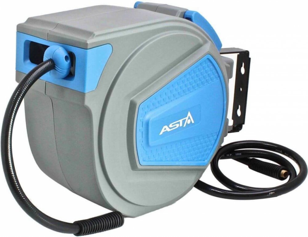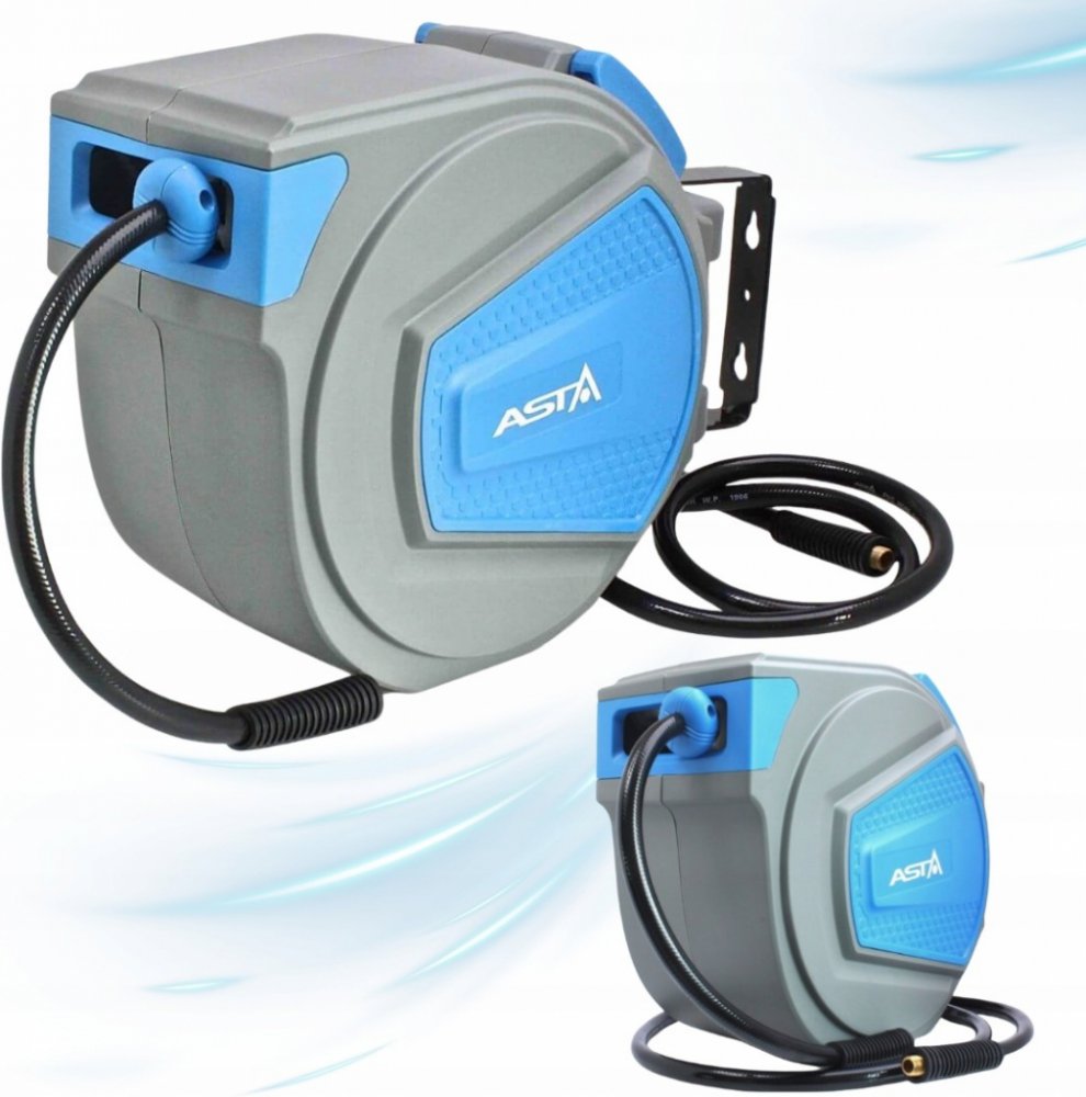 Automatický hadicový naviják – buben s hadicí na stlačený vzduch ASTA A-RPB20M Určeno k vedení stlačeného vzduchu např. od kompresoru k pneumatickému nářadí. Pro upevnění na zeď nebo strop – držák umožňuje otáčení bubnu v rozmezí 180 °. Vytaženou hadici je možné díky západkovému mechanismu libovolně aretovat, povytažením hadice se zámek opět uvolní a hadici lze navinout. Hadice je vyrobena z PVC. Schránka bubnu je z odolného plastu. Technická data: Délka hadice: 20 metrů Připojovací hlavice: 1/4“ Vnitřní průměr hadice: 9,5 mm Max. tlak: 12 bar Rozsah pracovních teplot: - 20 °C až + 50 °C