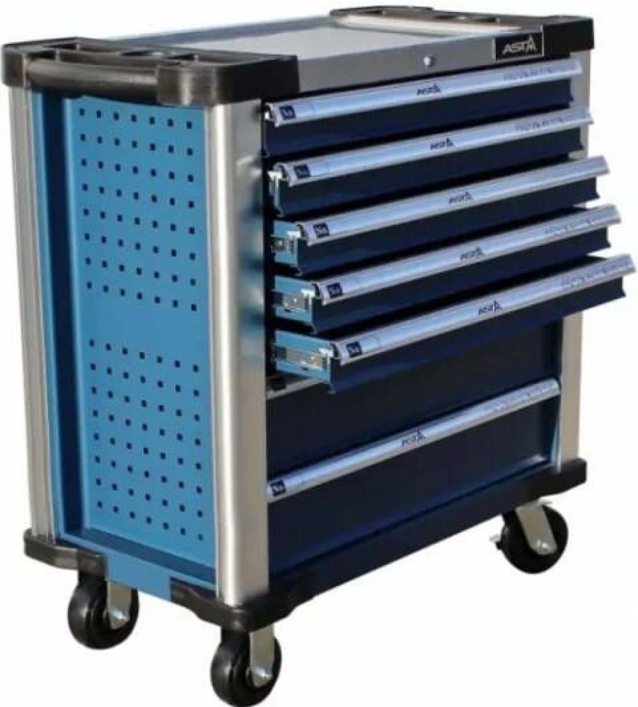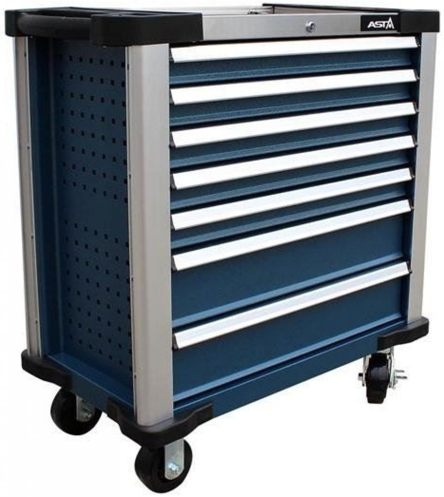 Dílenský montážní vozík na nářadí se 7 šuplíky, vrchní deska z nerezové oceli, uzamykatelný, modrá barva – ASTA ASTA3607B Moderní a praktický vozík na nářadí a servisní/dílenské vybavení. Sedm centrálně uzamykatelných zásuvek poskytuje dostatečnou úložnou kapacitu na větší i menší předměty. Dodáváno bez výbavy: obsah si můžete poskládat zcela podle svých požadavků. Technické parametry: - rozměry 5 vrchních zásuvek: 700x400x60 mm - rozměry 2 spodních zásuvek: 700x400x138 mm - šířka vozíku: 995 mm - hloubka vozíku: 475 mm - výška vozíku: 985 mm - hmotnost: 75 kg