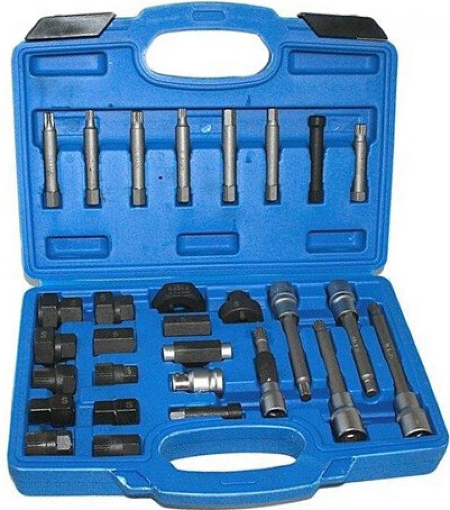 Sada 30 ks klíčů, adaptérů a hlavic pro montáž a demontáž alternátorů:Tato sada lze použít pro servis většiny nejpoužívanějších alternátorů a také k demontáži řemenic z alternátorů.Celá sada je přehledně uložena v plastovém kufříku, kde má každá součástka své přesné místo.Lze použít ve vozidlech: Volkswagen, Audi, Škoda, BMW, Mercedes-Benz, Opel, Peugeot, Citroën, Fiat, Toyota, Ford, Porsche Sada ...