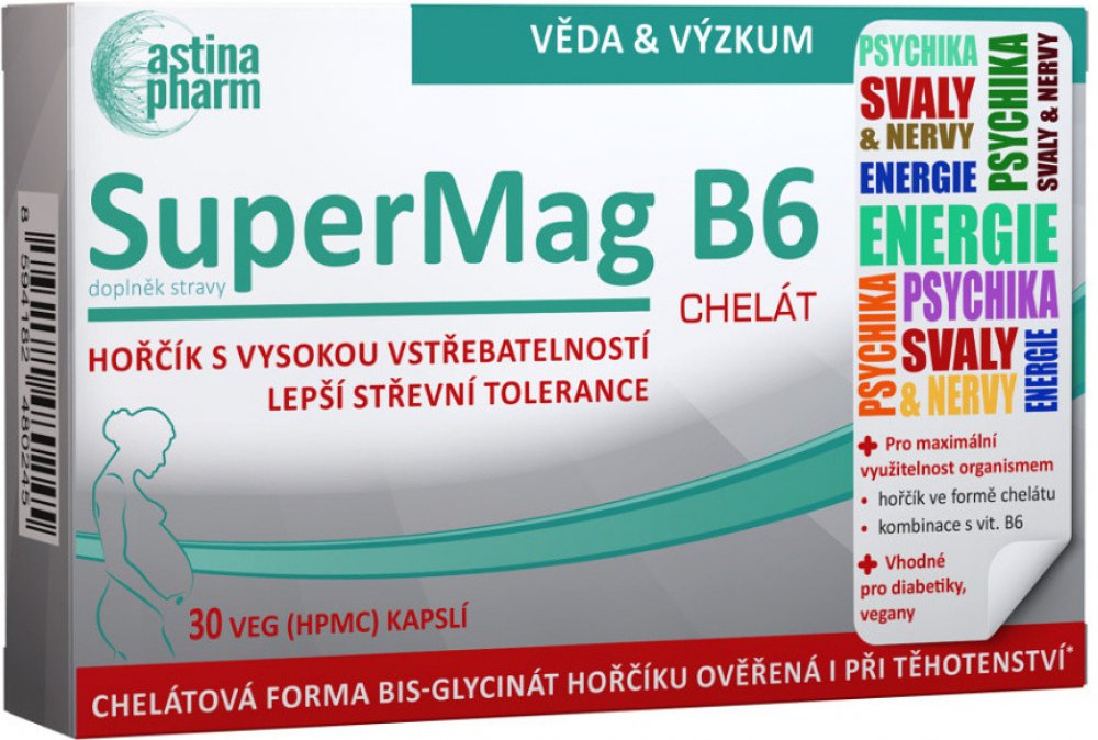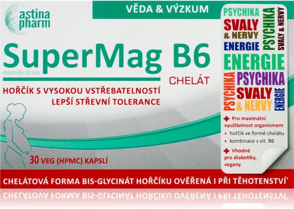 Doplněk stravy ve formě kapslí obsahuje hořčík (ve formě chelátu) a vitamin B6. Chelát Mg: diglycinát hořečnatý je vysoce efektivní forma hořčíku s vysokou biologickou dostupností, nižším rizikem střevních potíží a prokázanou účinností i u těhotných žen a dětí. Magnézium (hořčík) a vitamin B6 (pyridoxin) přispívají k normální činnosti nervové soustavy, ke snížení míry únavy a vyčerpání, normálnímu...