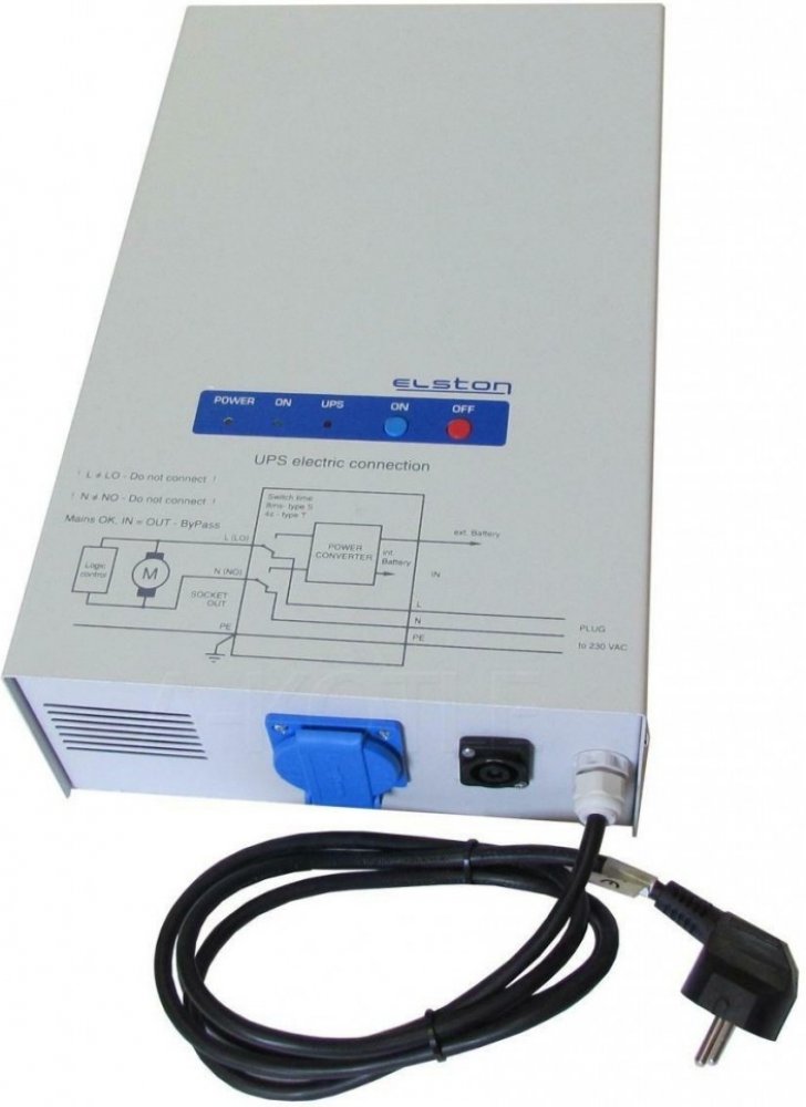 Záložní zdroj (UPS) pro zálohování chodu elektrického oběhového čerpadla v topných systémech při výpadu elektřiny. Zdroj je určen pro zálohování jednoho oběhového čerpadla do max. příkonu 150W. Doba zálohování je zobrazena v tabulce mezi obrázky. Záložní zdroj Elston se montuje svisle na stěnu.Záložní zdroj má uvnitř zabudovanou vlastní baterii. Její životnost je minimálně 5 let. Pak je možné koupit náhradní baterii a vyměnit ji uvnitř zdroje (výměnu zvládne i laik).Tento záložní zdroj není možné instalovat na chatách či chalupách, kde při odchodu vypínáte elektřinu hlavním jističem. Záložní zdroj má i bez odběru proudu čerpadlem malou spotřebu elektřiny, čímž by se baterie po určité době zcela vybila a dramaticky by se snížila její životnost. Pokud chcete vypínat hlavní jistič, je nutné před odjezdem odpojit baterii od záložního zdroje.Zdroj má sinusový výstup střídavého proudu a je vhodný pro obyčejné čerpadla, jakož i pro oběhová čerpadla s elektronickou regulací. Záložní zdroj je možné použít i pro zálohování elektroniky kotlů.Popis činnosti:Pokud dojde k výpadu elektřiny, do 10ms začne zdroj automaticky zálohovat spotřebič. Doba zálohování je znázorněna mezi obrázky. Pokud trvá výpadek elektřiny déle než je doba zálohování, dojde k řízenému vypnutí záložního zdroje tak, aby nedošlo k úplnému vybití a zničení baterie.Při obnovení dodávky elektrické energie přepne záložní zdroj zálohované zařízení na napájení ze sítě. Současně začne nabíjet akumulátor a spustí autotest. Nabitý akumulátor je následně udržován v tzv. konzervačním režimu na 100% kapacity. V průběhu zálohování je hlídán stav akumulátoru, napětí akumulátoru je signalizováno kontrolkou POWER.V případě, že se baterie blíží ke svému úplnému vybití, spustí zdroj alarm, který na tento stav upozorňuje přerušovaným zvukovým signálem a kontrolka POWER bliká. Při úplném vybití zdroj zastaví zálohování a odpojí akumulátor - vždy tak, aby nedošlo k jeho poškození. Alarm zůstává spuštěn ještě 5 minut po vybití.