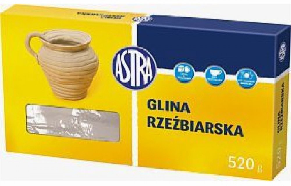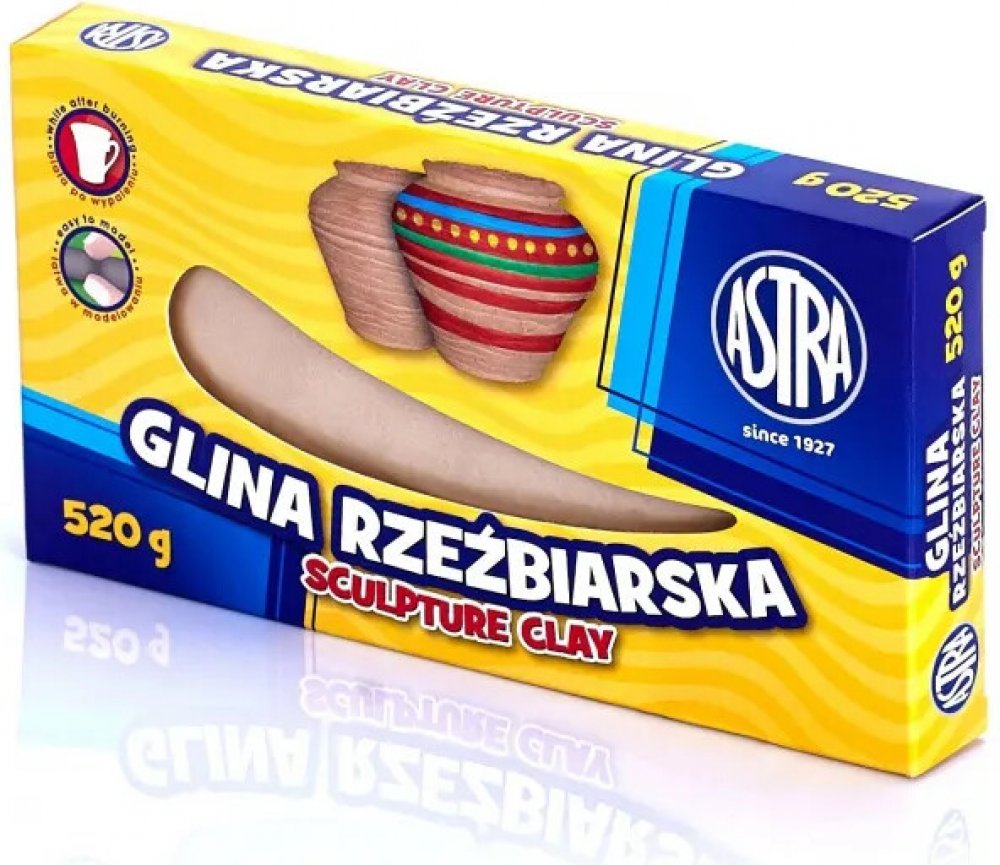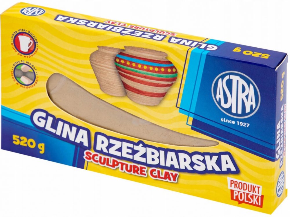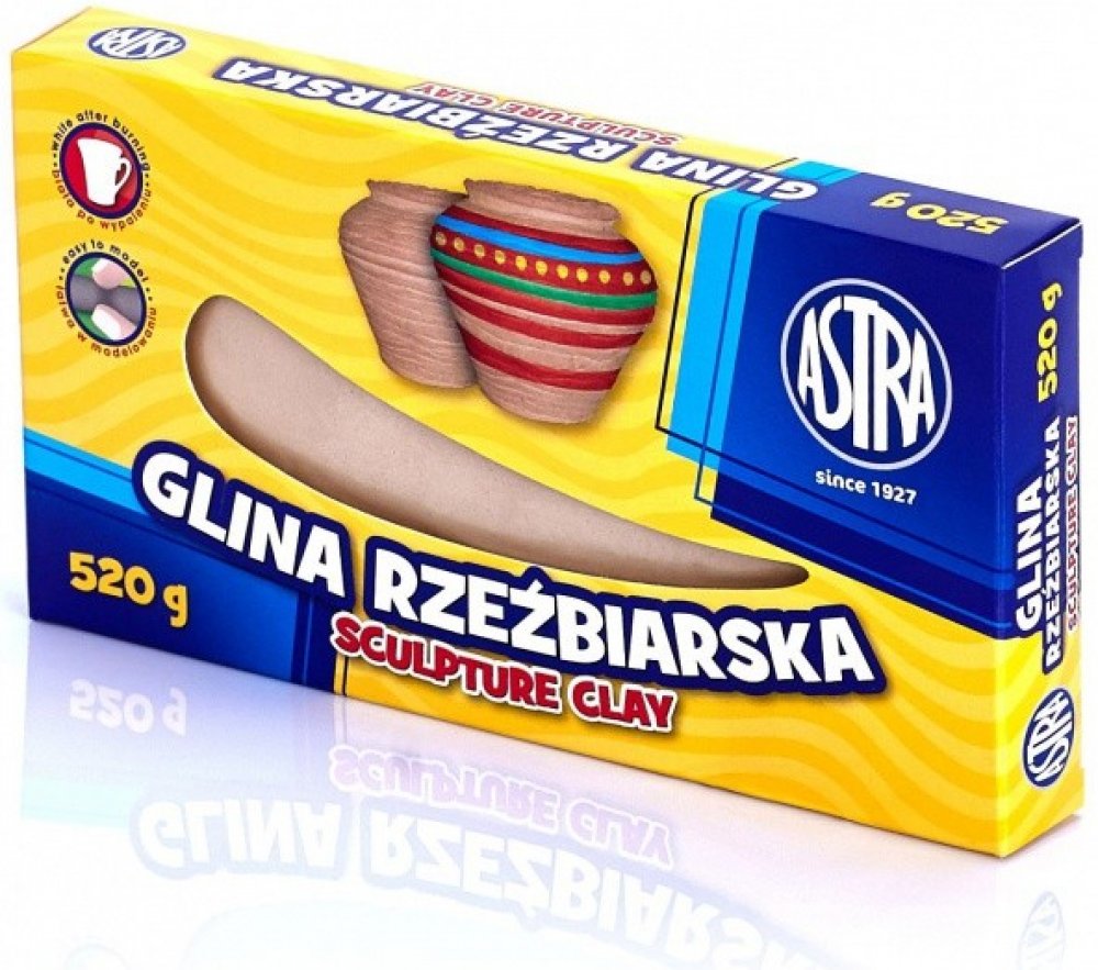 Sochařská / keramická hlína od společnosti ASTRA je modelovací materiál vyrobený z přírodních surovin a je určen k modelování, sochařským pracím, tvarování na kruhu, otiskem a odlévání v sádrových formách. Je jedním z nejvšestrannějších tvůrčích produktů na trhu.• balení obsahuje 520g hmoty v přírodním pískovém odstínu, po vypálení je hmota bílá • hotové modely je možné ponechat volnému schnutí nebo vypálit v keramické peci při teplotě od 850 ° C - 1100 ° C. • vypálené nebo uschlé výrobky lze zdobit všemi barvami od společnosti ASTRA • obsah balení: 520g • výrobce: ASTRA POLSKA, EU