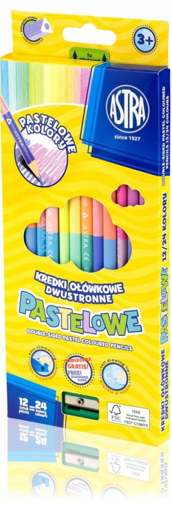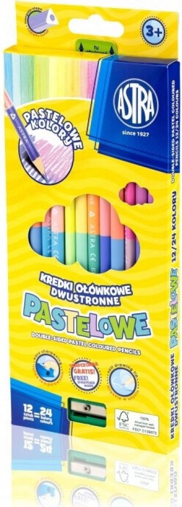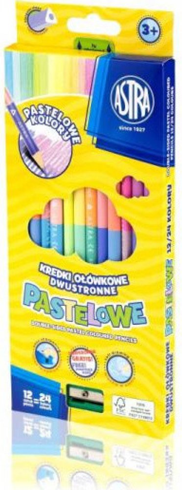 Oboustranné trojhranné pastelky = 2x tolik barev. Balení obsahuje 12 ks pastelek v krásných pastelových odstínech, které mají na obou stranách jiné barvy. V sadě je také ořezávátko. Pastelky jsou určeny ke kreslení, vybarvování a psaní na papír. Určené dětem ve věku od 3 let. Baleno v papírové krabiččce.