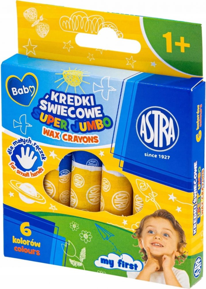 Kvalitní voskové pastelky ASTRA v provedení jumbo přinášejí intenzivní a syté barvy a jemný, rovný tah. Díky složení nešpiní ruce, jsou bez zápachu, nelámou se, nelepí a nevylučují škodlivé látky. Skvělé na papír, karton i dřevo.Objevte pohodlné kreslení s voskovými pastelkami ASTRA jumbo. Jejich okrouhlý tvar a větší průměr 9 mm skvěle padnou do ruky a umožní plynulý, rovnoměrný tah s krásně inte...